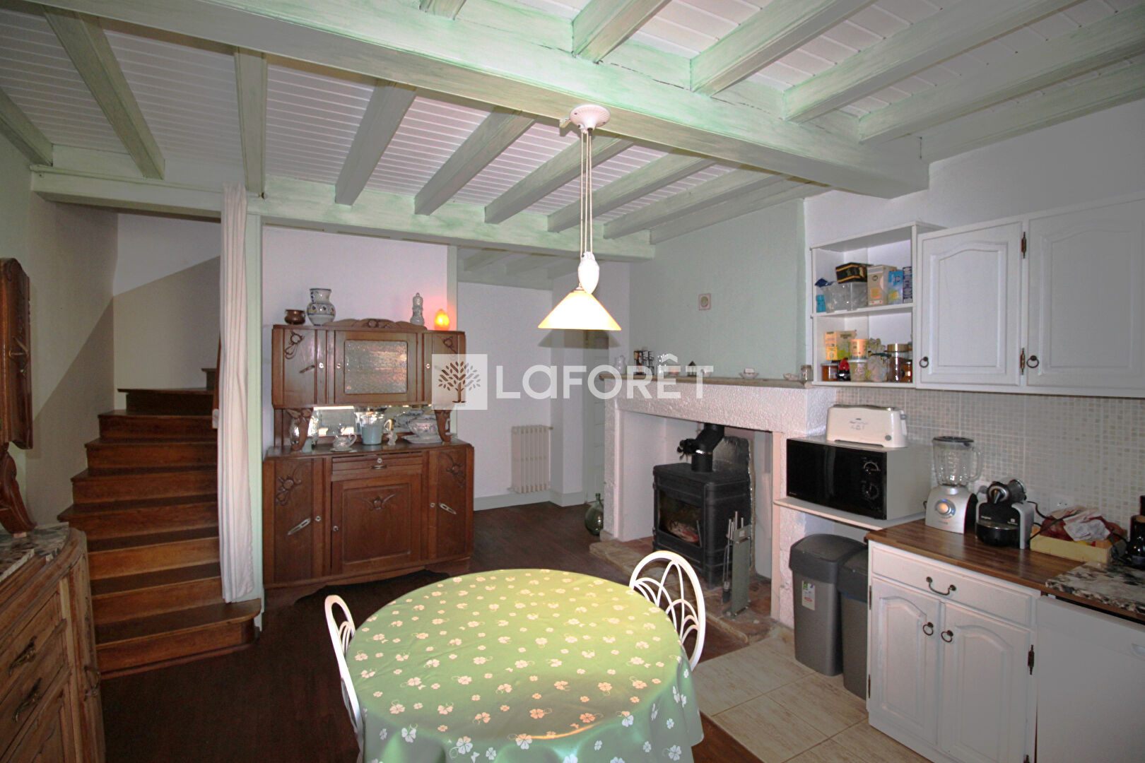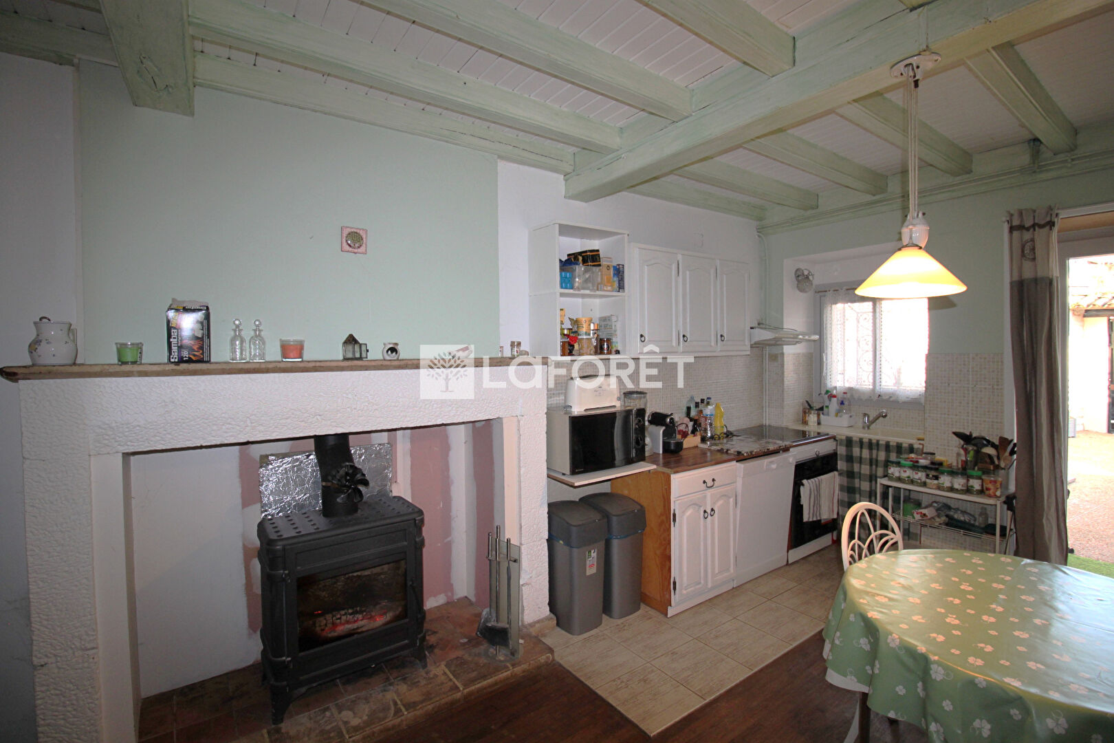 L'entrée se fait par la cour, exposée Sud, qui distribue la maison principale et le studio. Entrée sur la pièce cuisine/salle à manger d'environ 20m², agrémentée d'une cheminée équipée d'un poêle à bois qui chauffe toute la maison. En suivant, le salon d'environ 21 m².