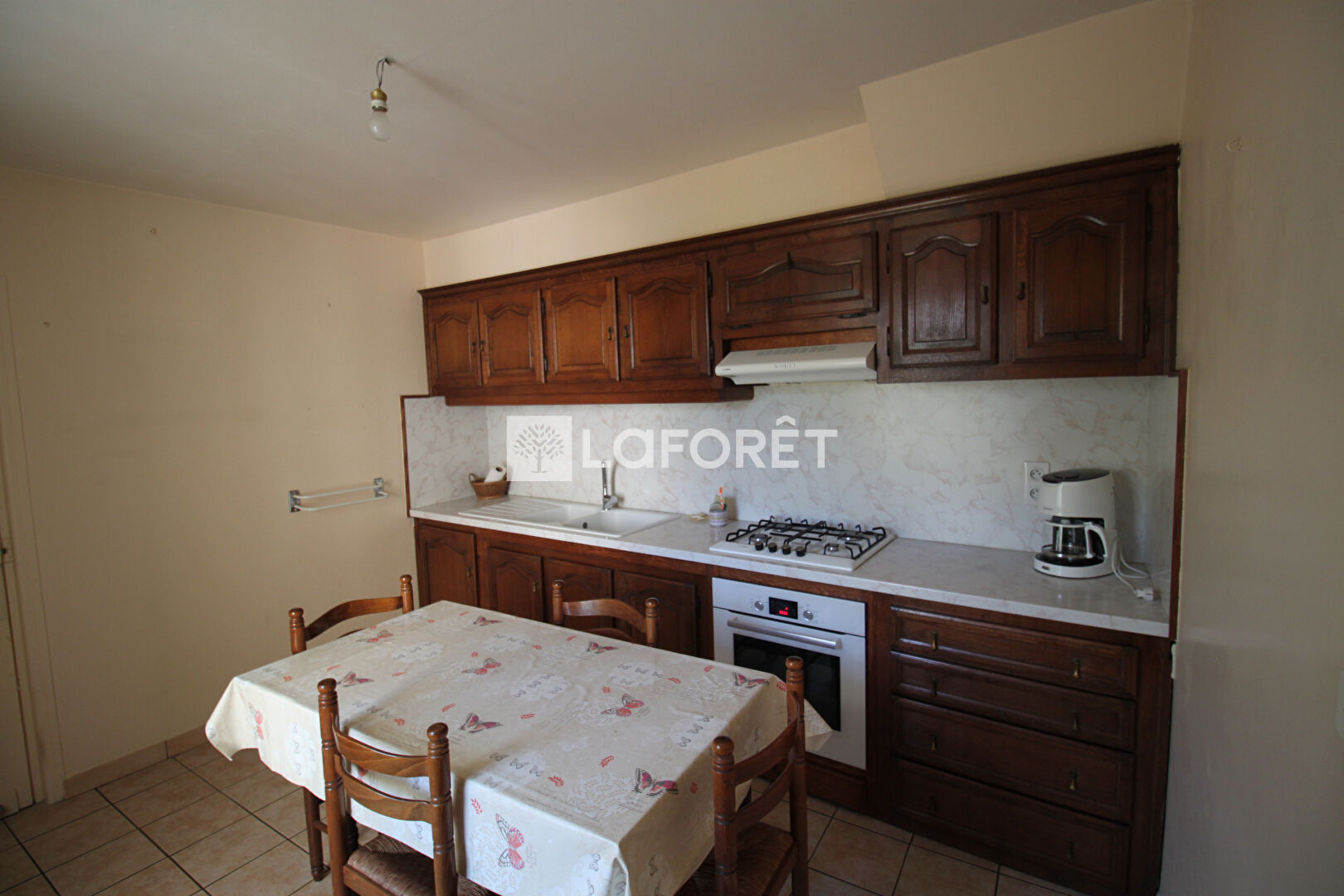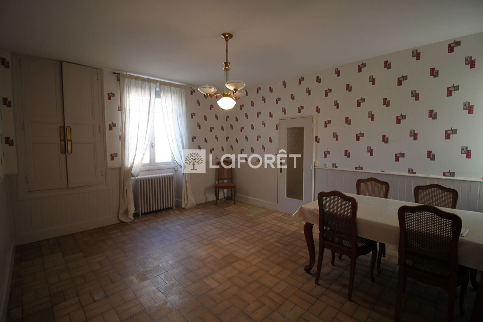 A droite, une salle à manger de même superficie avec dans son prolongement, la cuisine aménagée et la buanderie/chaufferie.