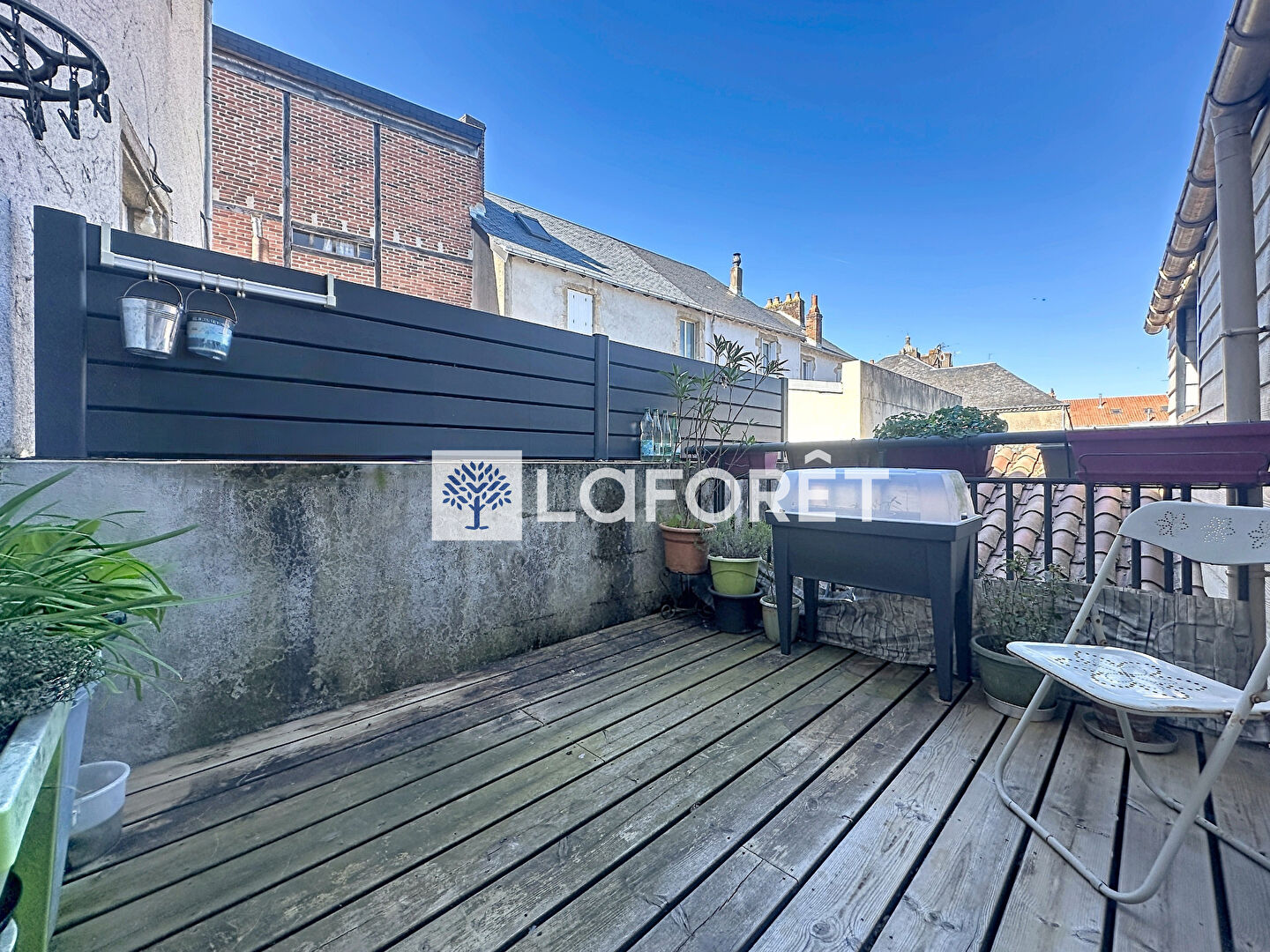 L'appartement, d'une surface de 92 m², est entièrement rénové et actuellement loué 630 €. Il dispose d'une entrée indépendante, d'une pièce de vie de 32 m² avec accès à une terrasse, de deux chambres, d'une salle d'eau et d'un WC.