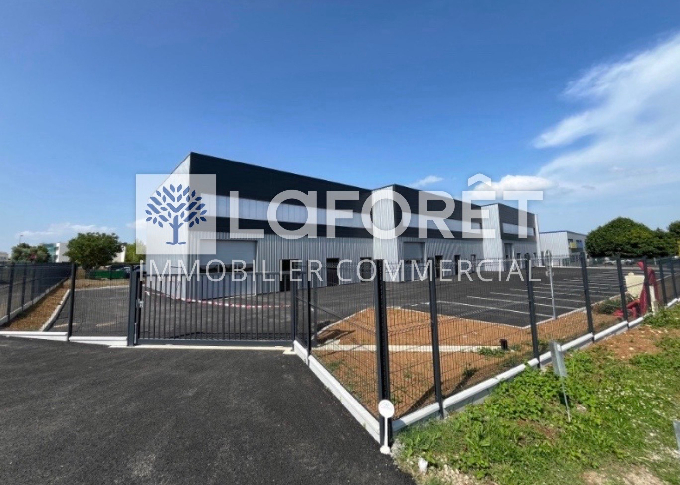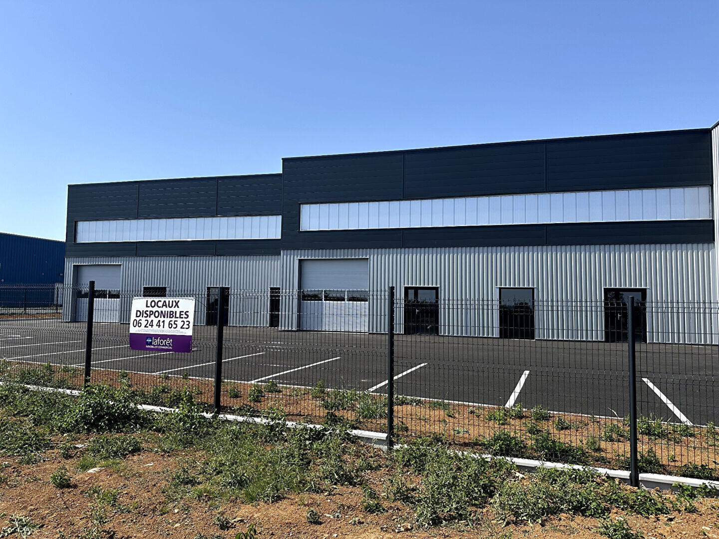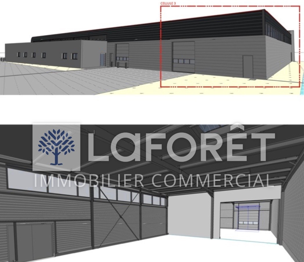 Bâtiment en bardage métallique, équipé d'une porte de service, d'une porte sectionnelle et de places de parking dédiées. L'ensemble est entièrement clôturé.