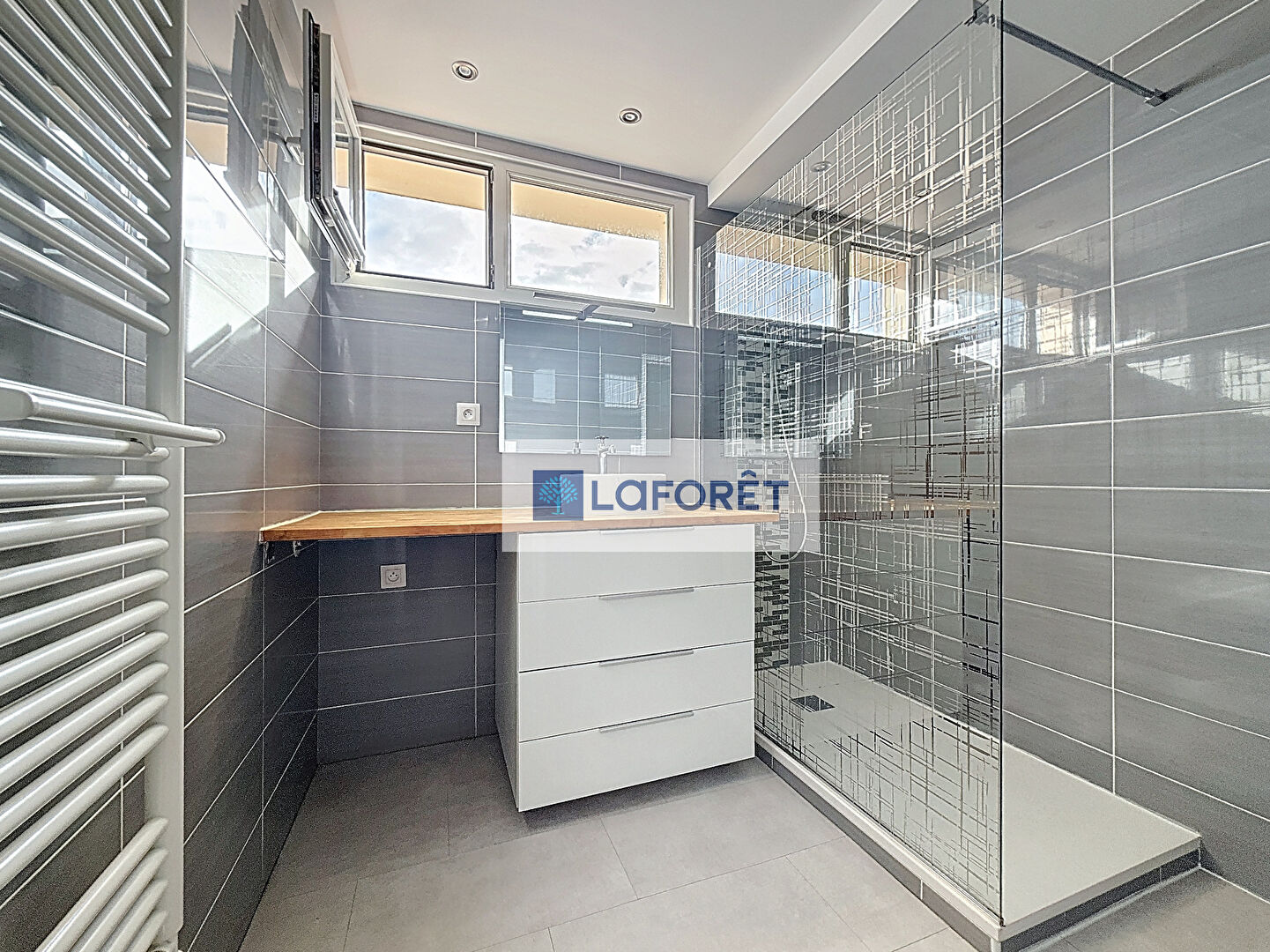La salle d'eau est récente, équipée d'un receveur extra-plat et bénéficiant d'une fenêtre ? un véritable atout en appartement ? offrant lumière naturelle et aération quotidienne.