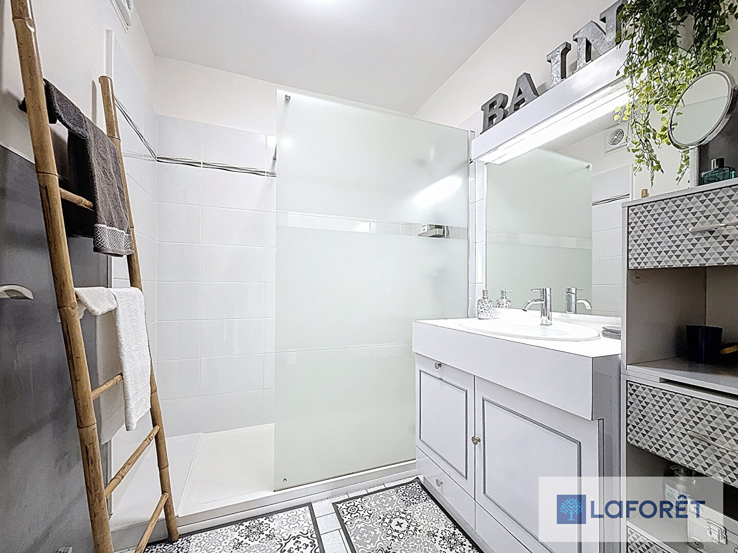 La salle d'eau récente bénéficie d'une très grande douche avec receveur extra-plat.