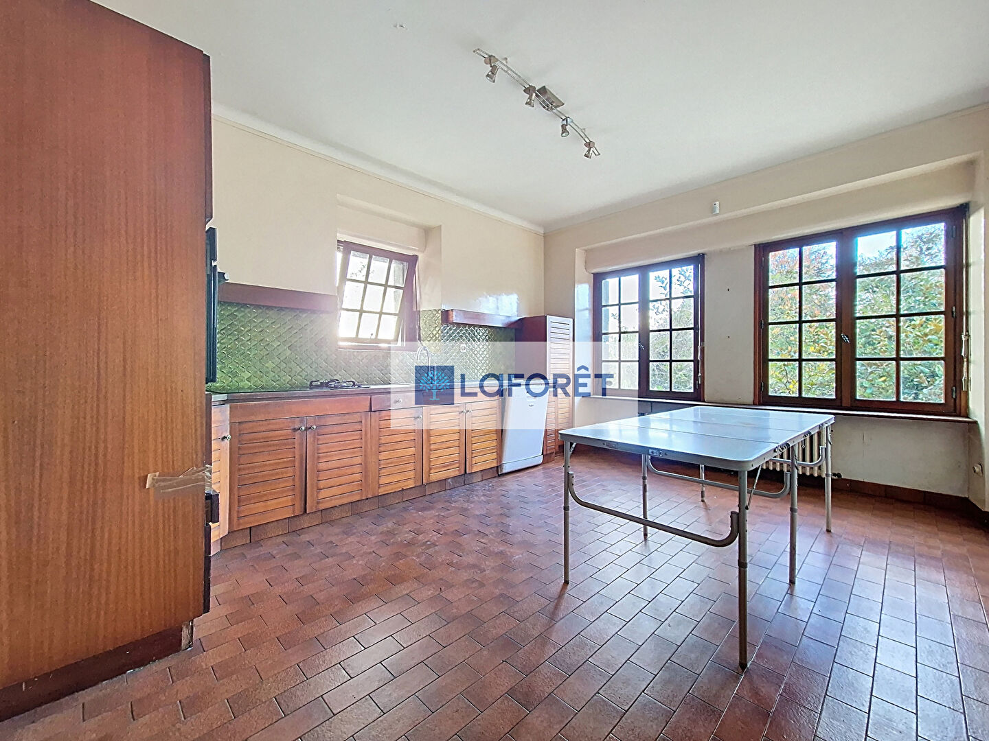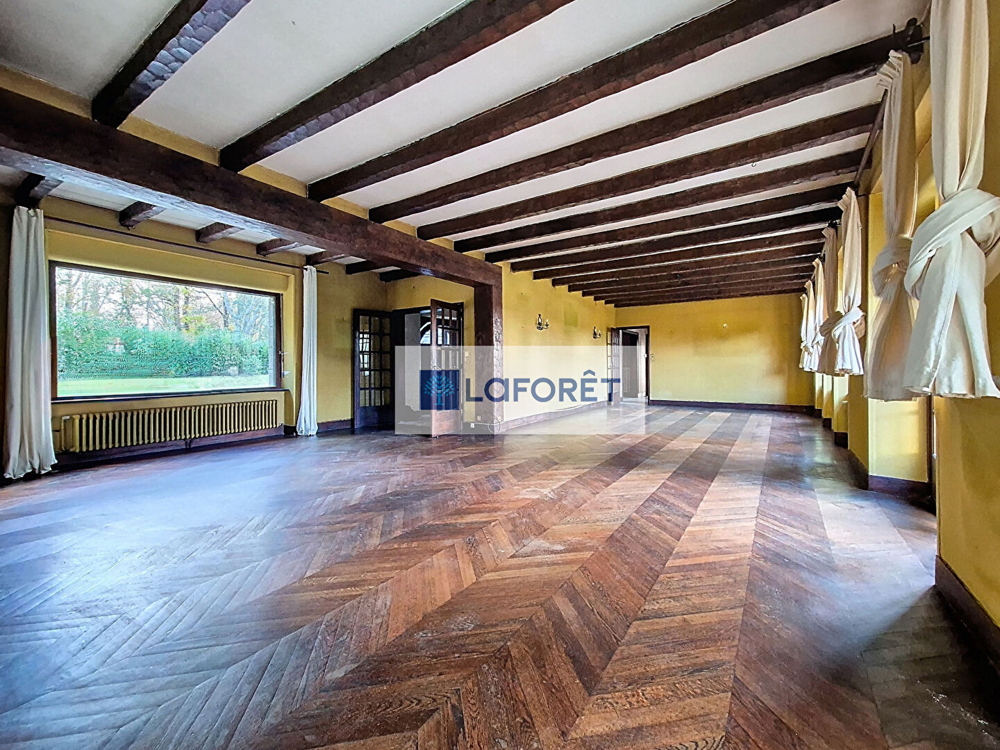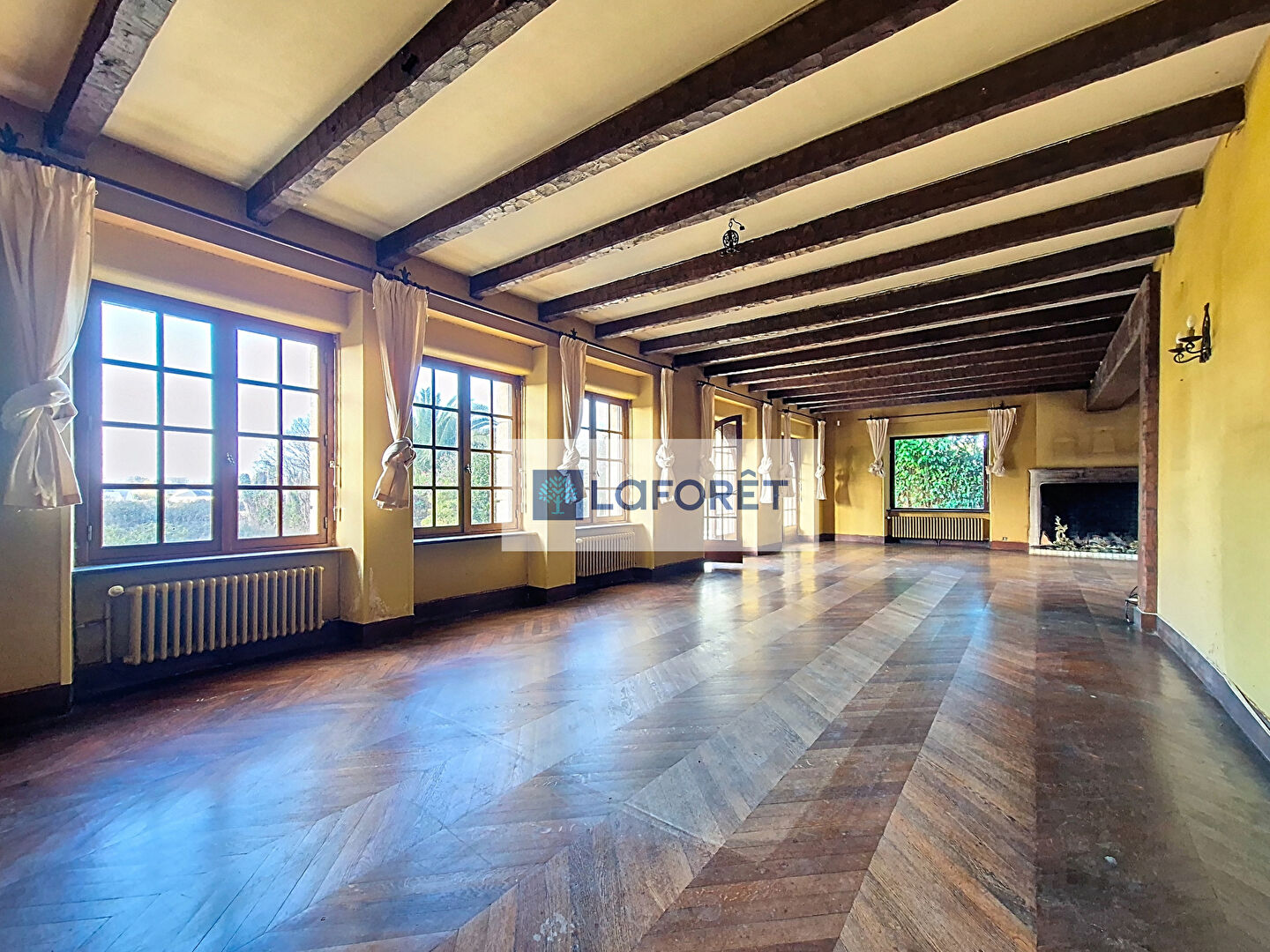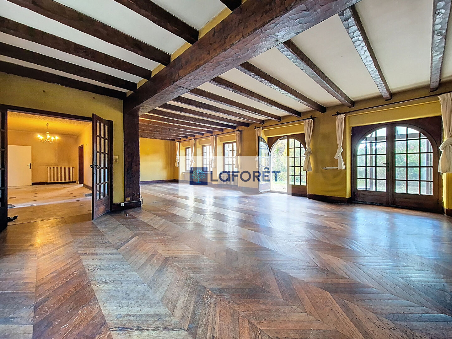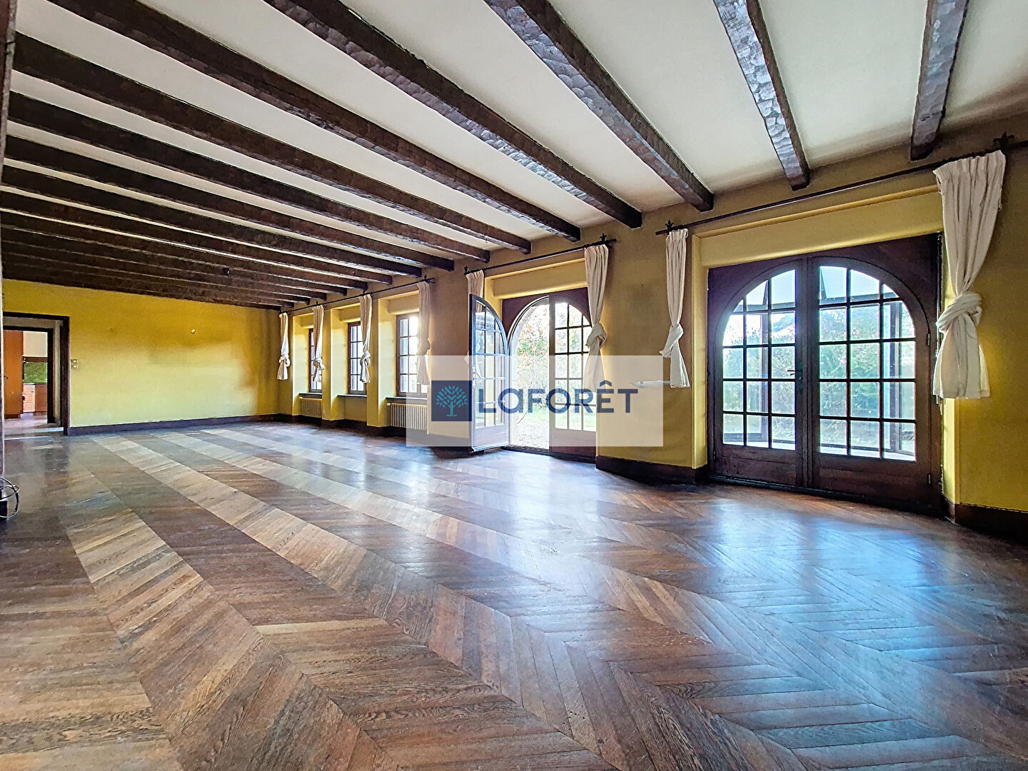 Le rez-de-chaussée se compose d'une grande entrée, d'un grand salon-séjour d'environ 70 m², très lumineux grâce à ses sept fenêtres, d'une cuisine aménagée et équipée, ainsi qu'un WC. Vous y trouverez également un espace indépendant de 70 m², autrefois utilisé comme cabinet médical.