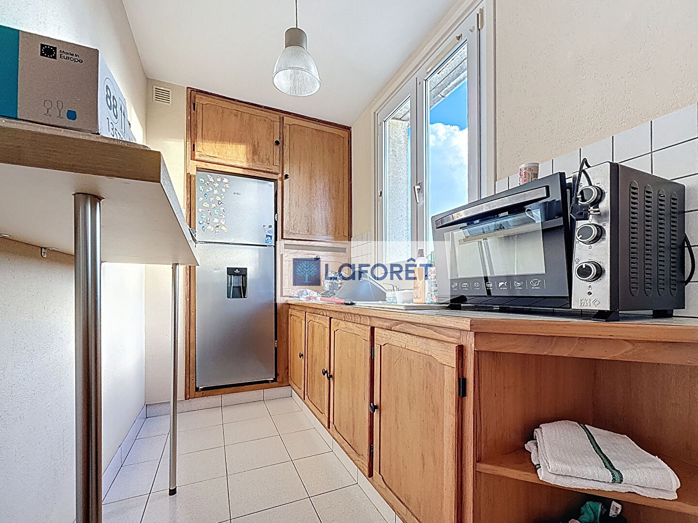 Il se compose d'une entrée donnant sur une pièce de vie avec cuisine ouverte entièrement équipée. L'appartement dispose de deux chambres, d'une salle d'eau fonctionnelle et d'un WC séparé.