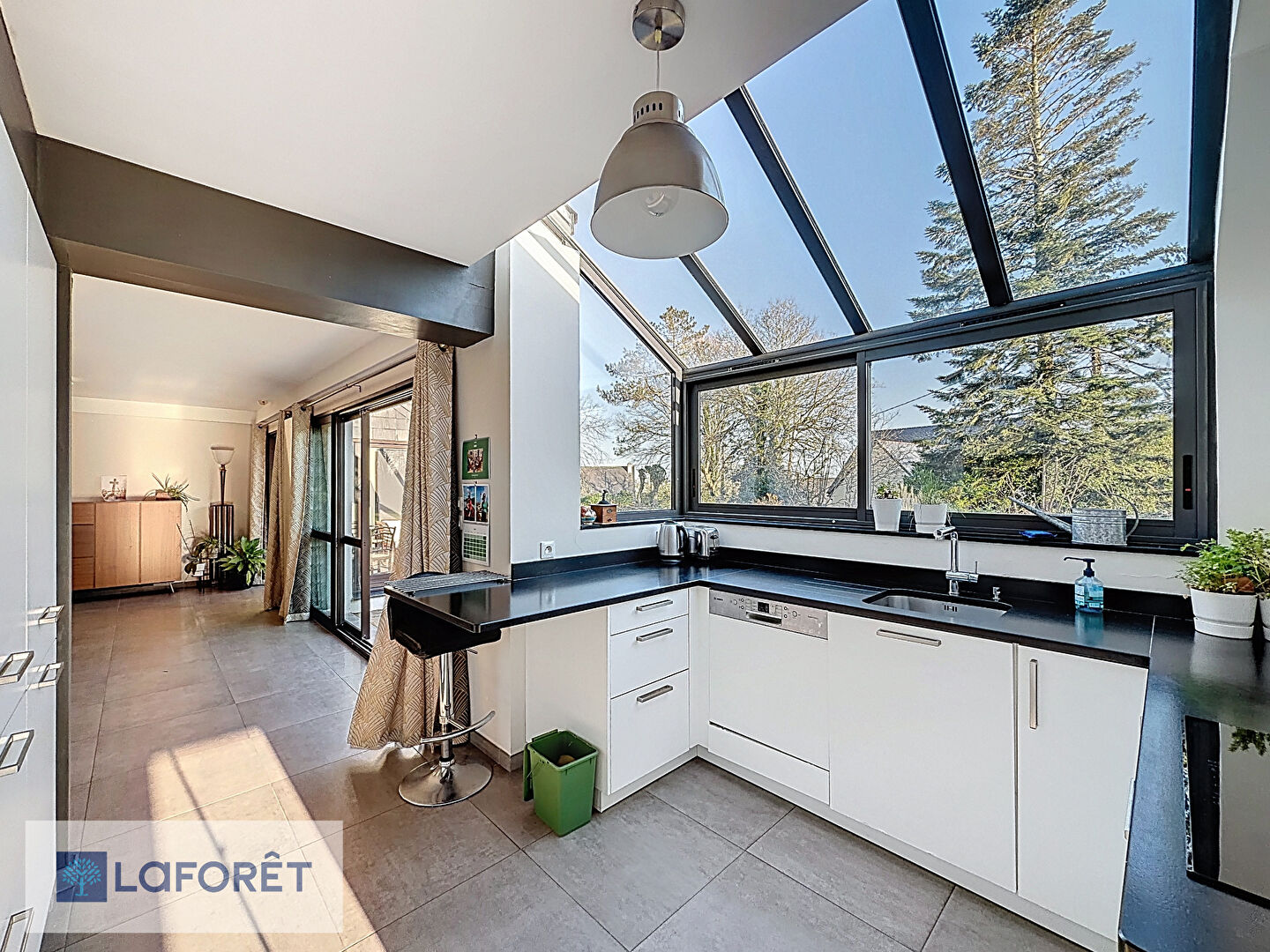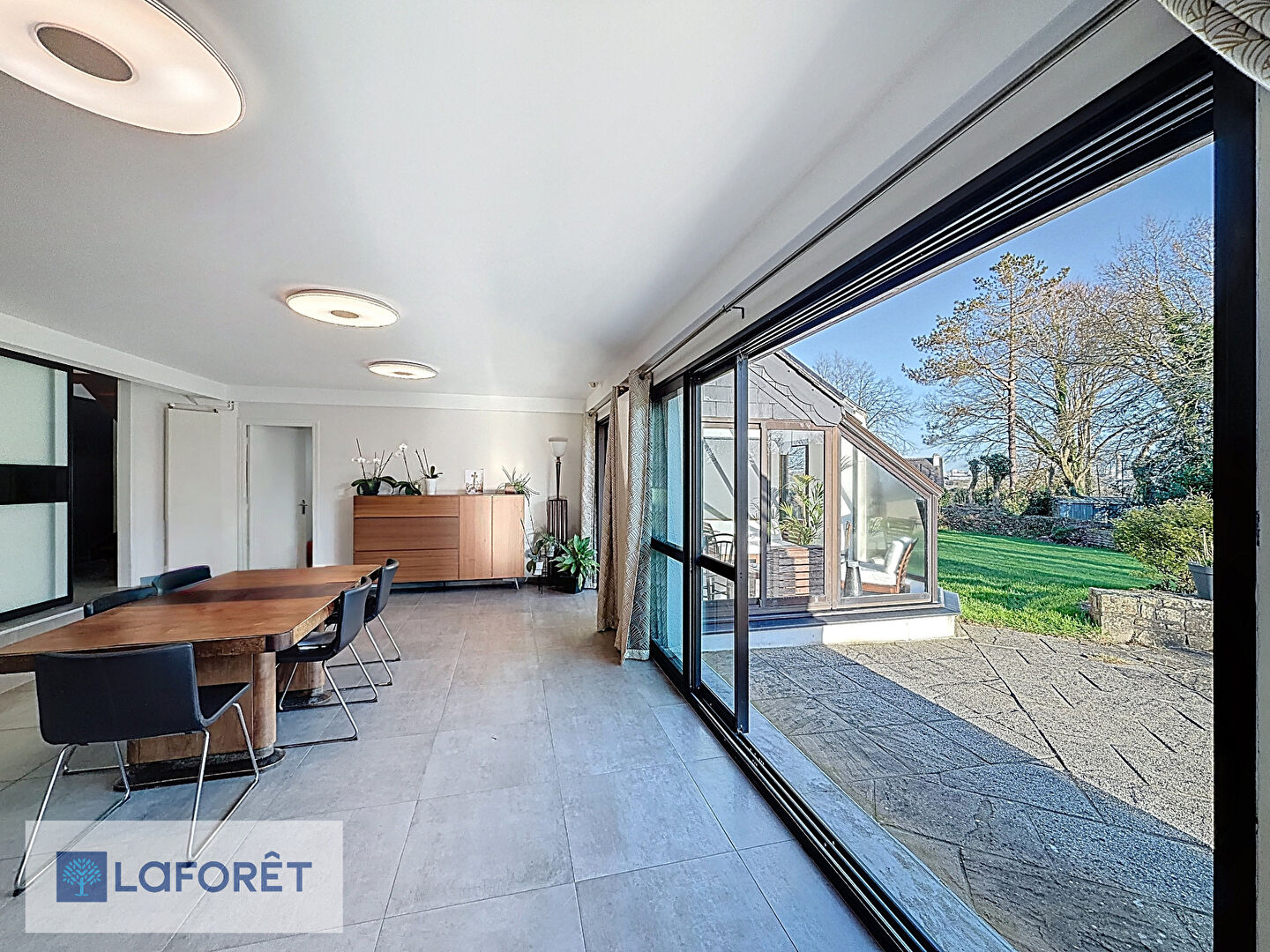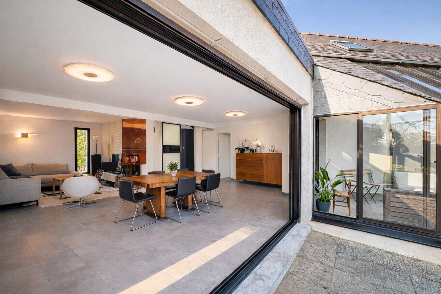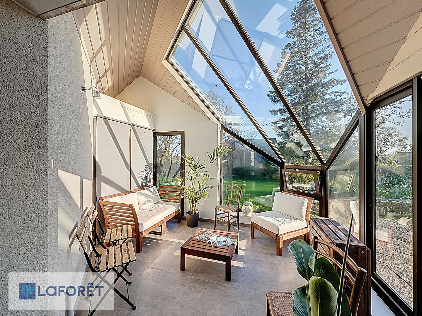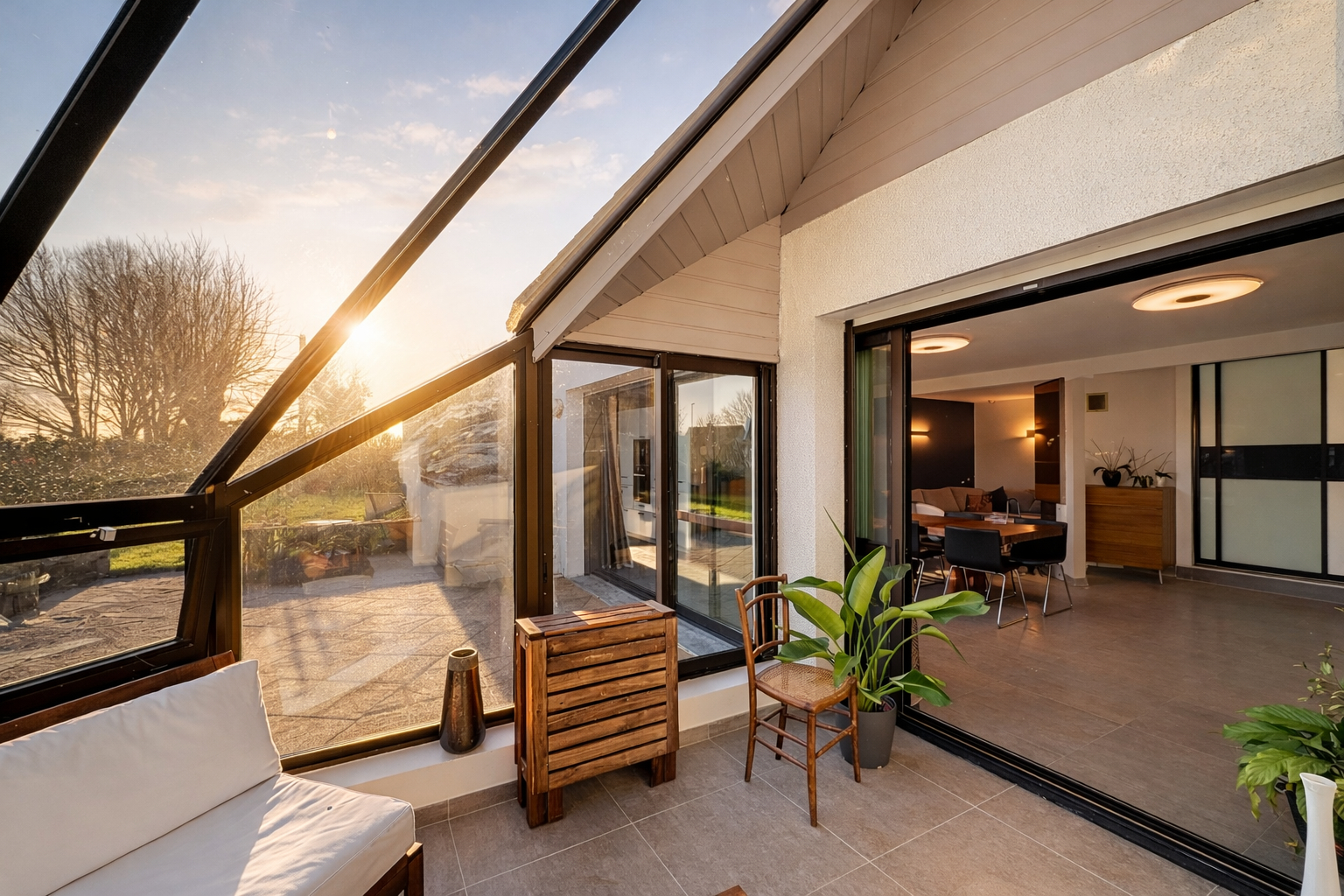 Un salon chaleureux avec cheminée à insert complète cet espace de vie, ainsi qu'un agréable jardin d'hiver.