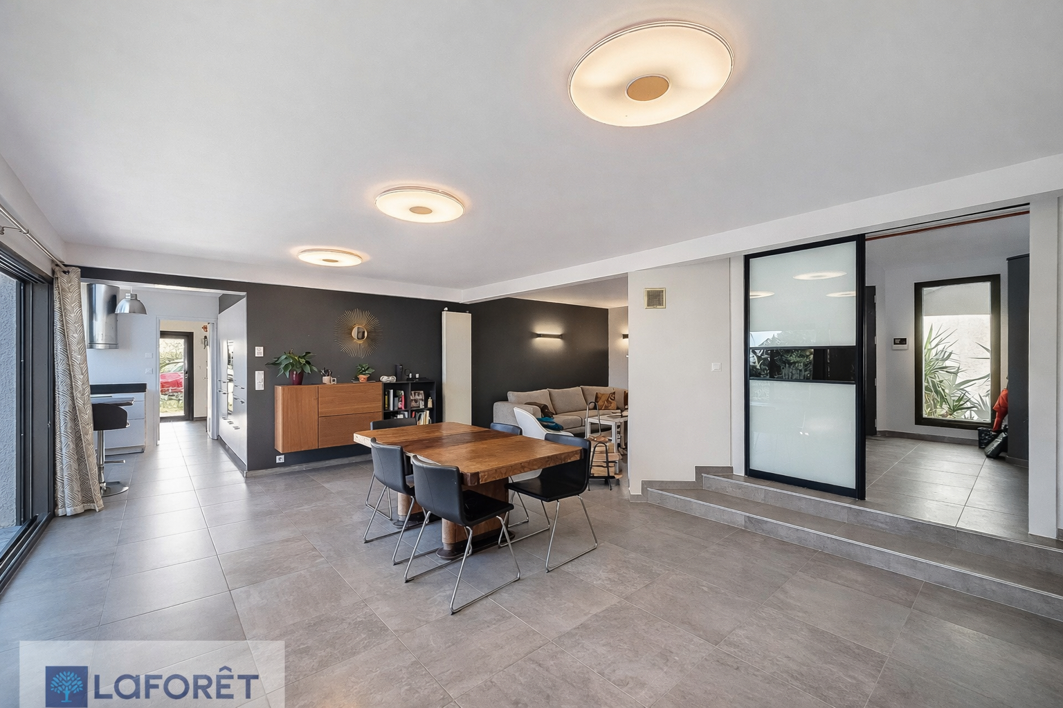 Au rez-de-chaussée, vous serez accueillis par un grand hall d'entrée menant à une spacieuse pièce de vie baignée de lumière, ouverte sur une cuisine entièrement aménagée et équipée plus un espace buanderie attenant.
