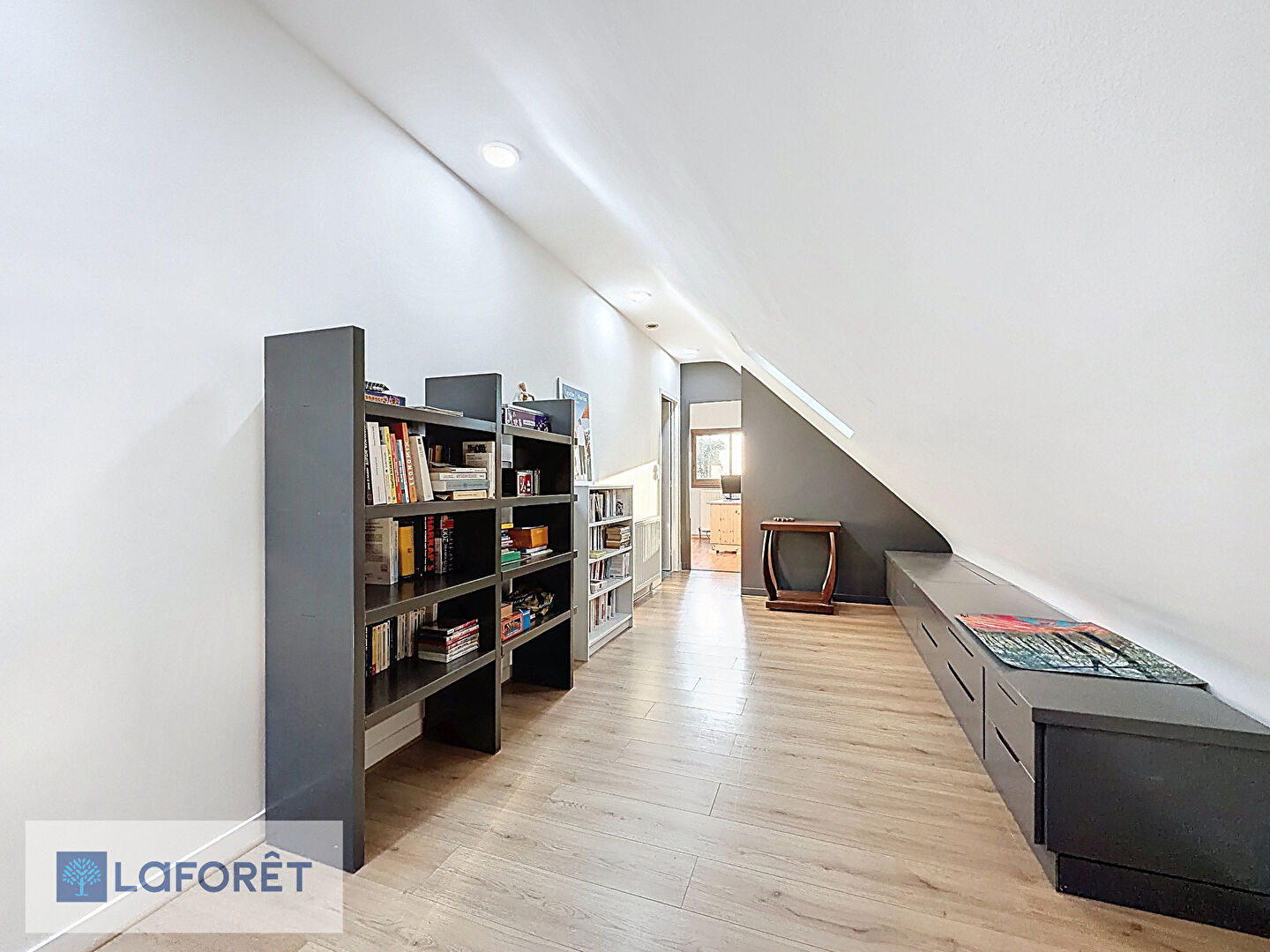 À l'étage, l'espace nuit s'organise autour d'une mezzanine desservant trois chambres, deux salles d'eau et un WC.