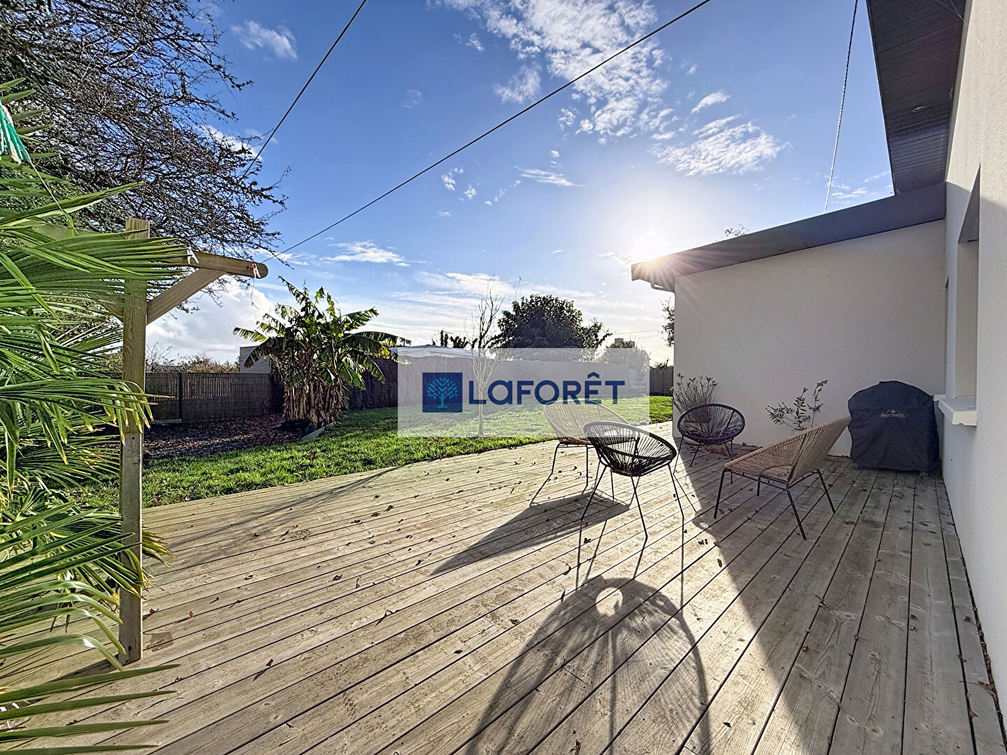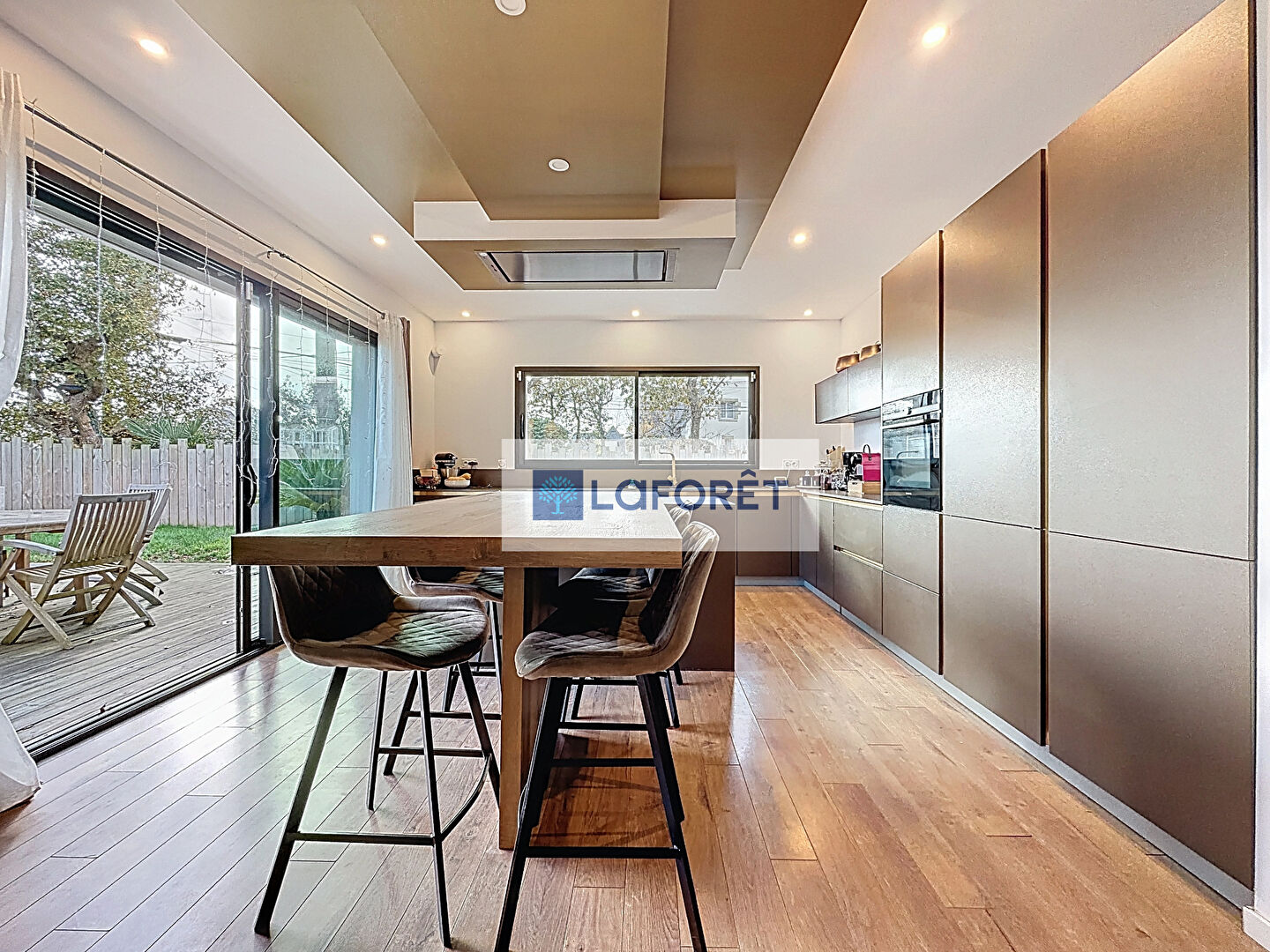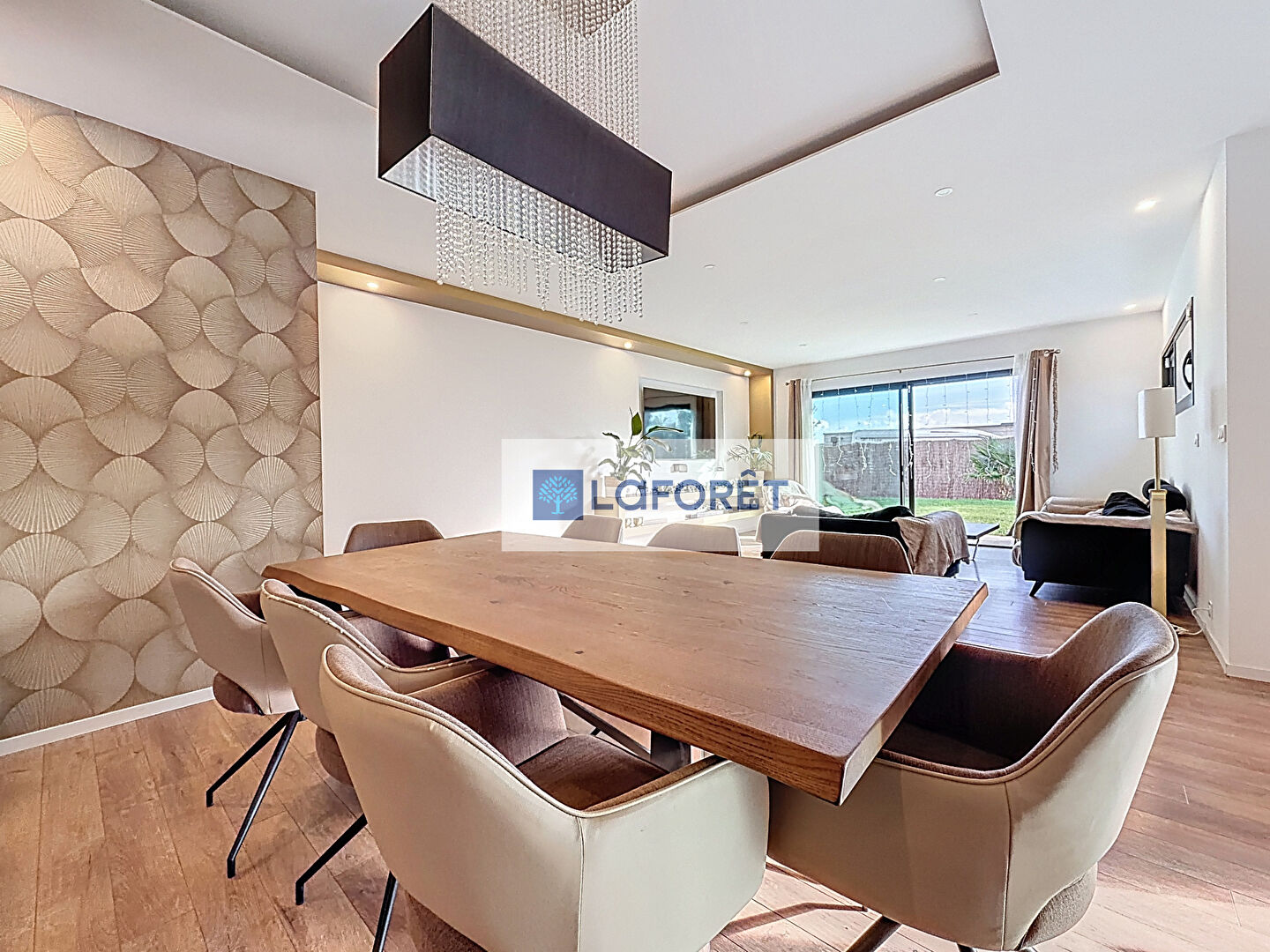La pièce de vie conviviale s'ouvre sur la terrasse et le jardin, avec une cuisine moderne entièrement aménagée et équipée.