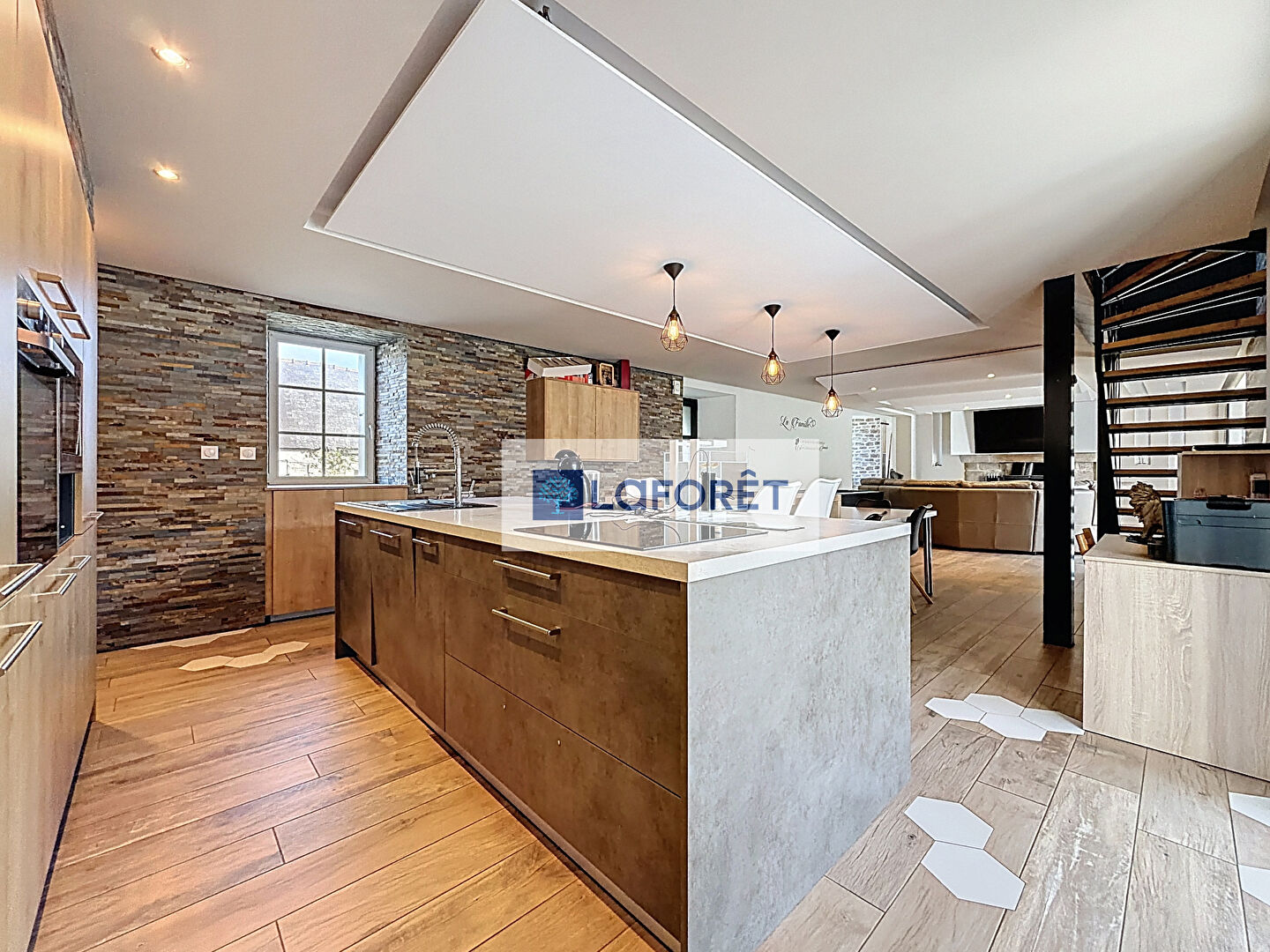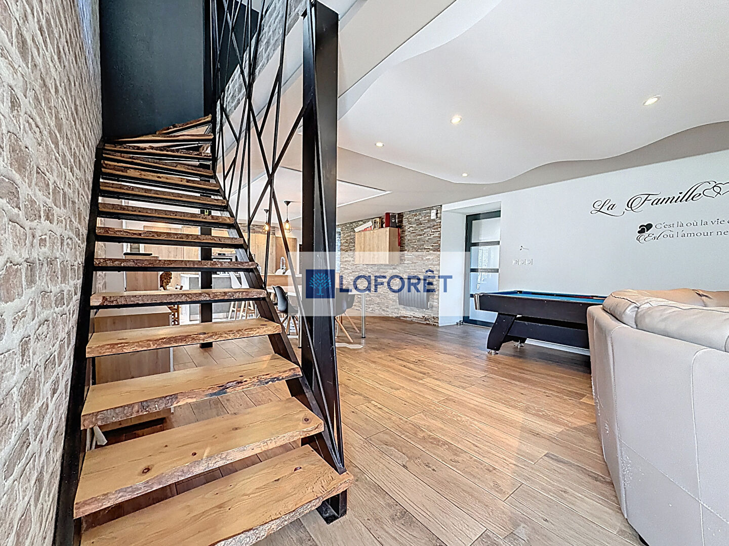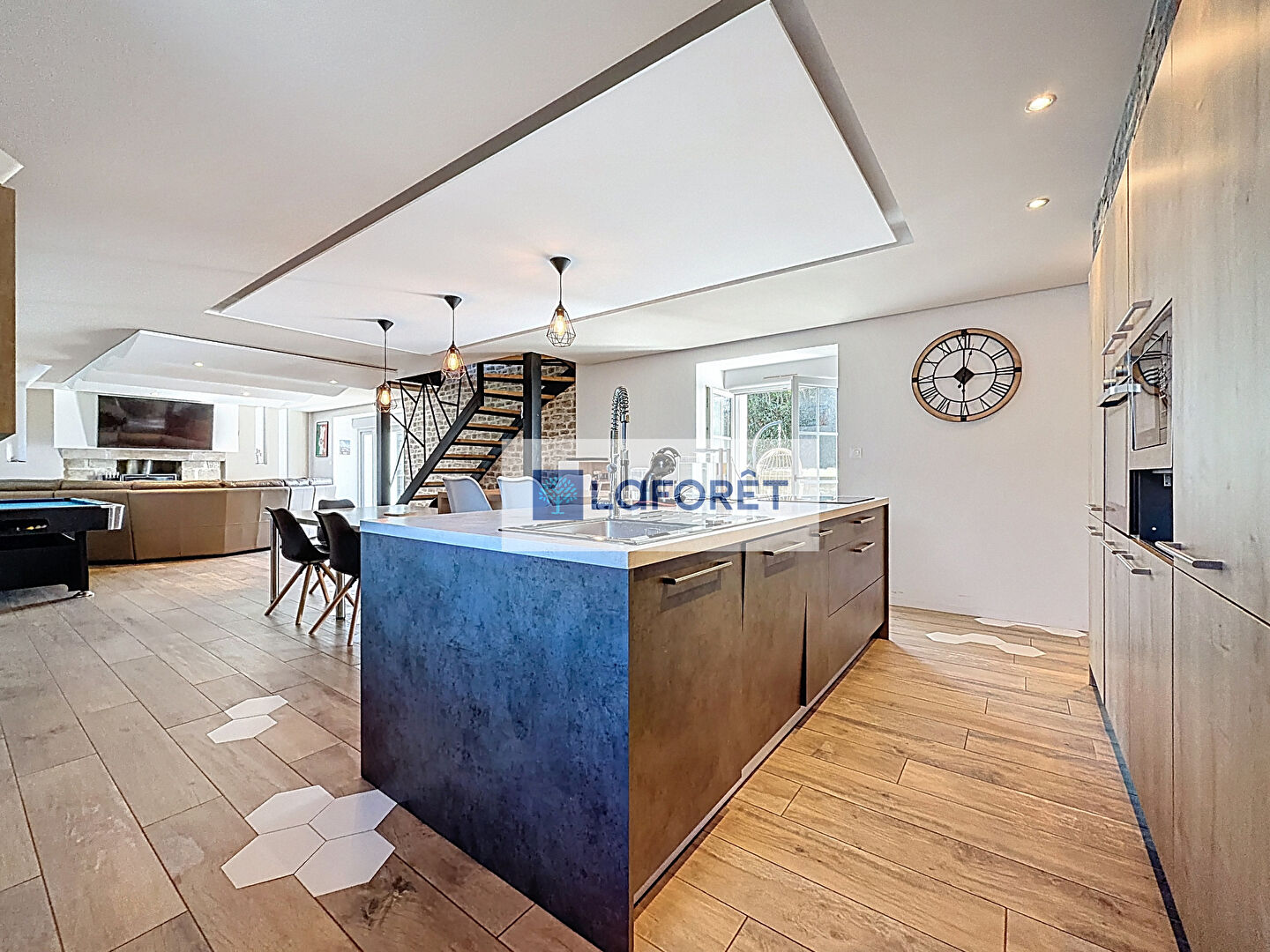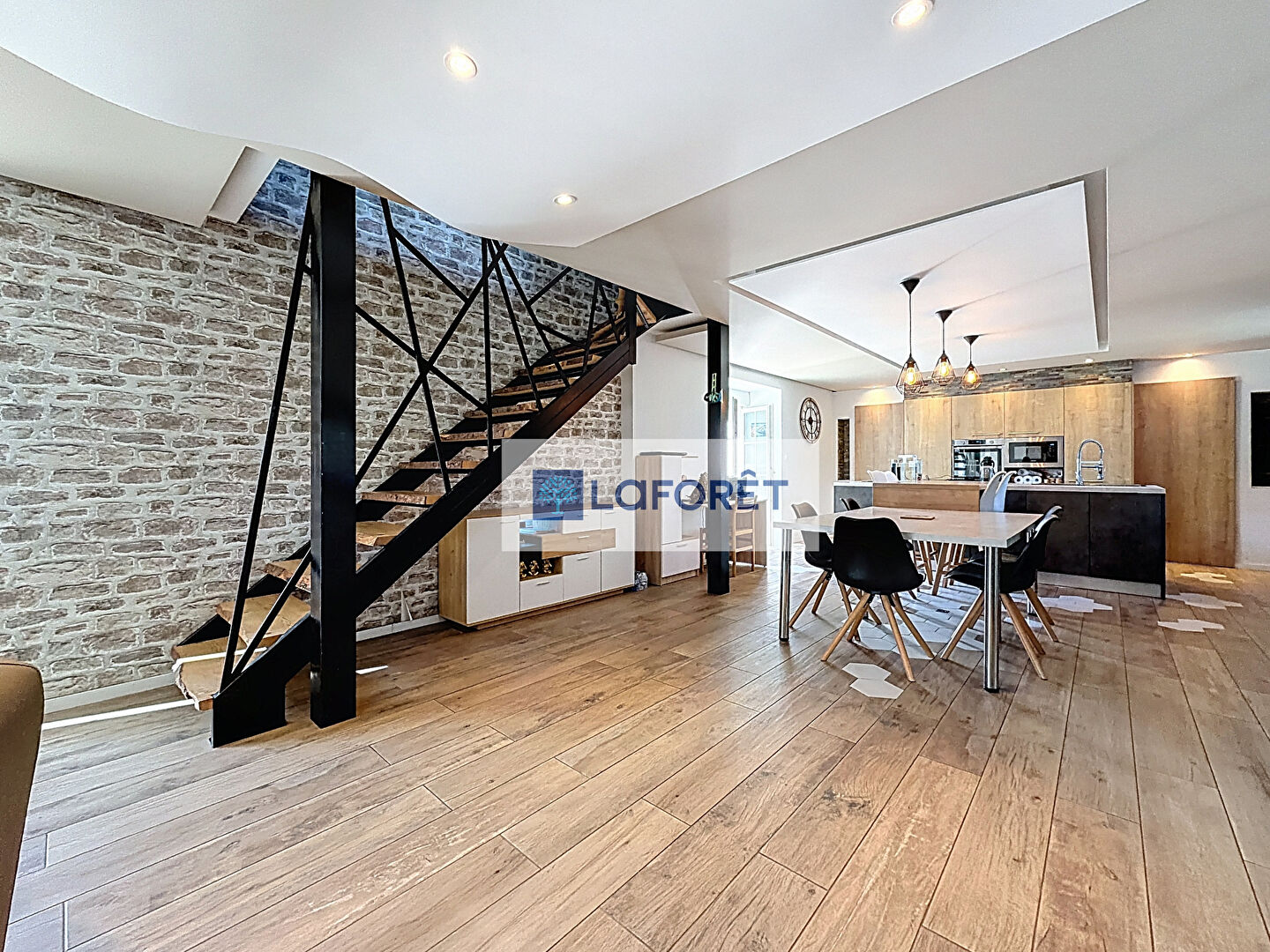 Une grande pièce de vie, ouverte sur une cuisine aménagée et équipée + un espace buanderie.