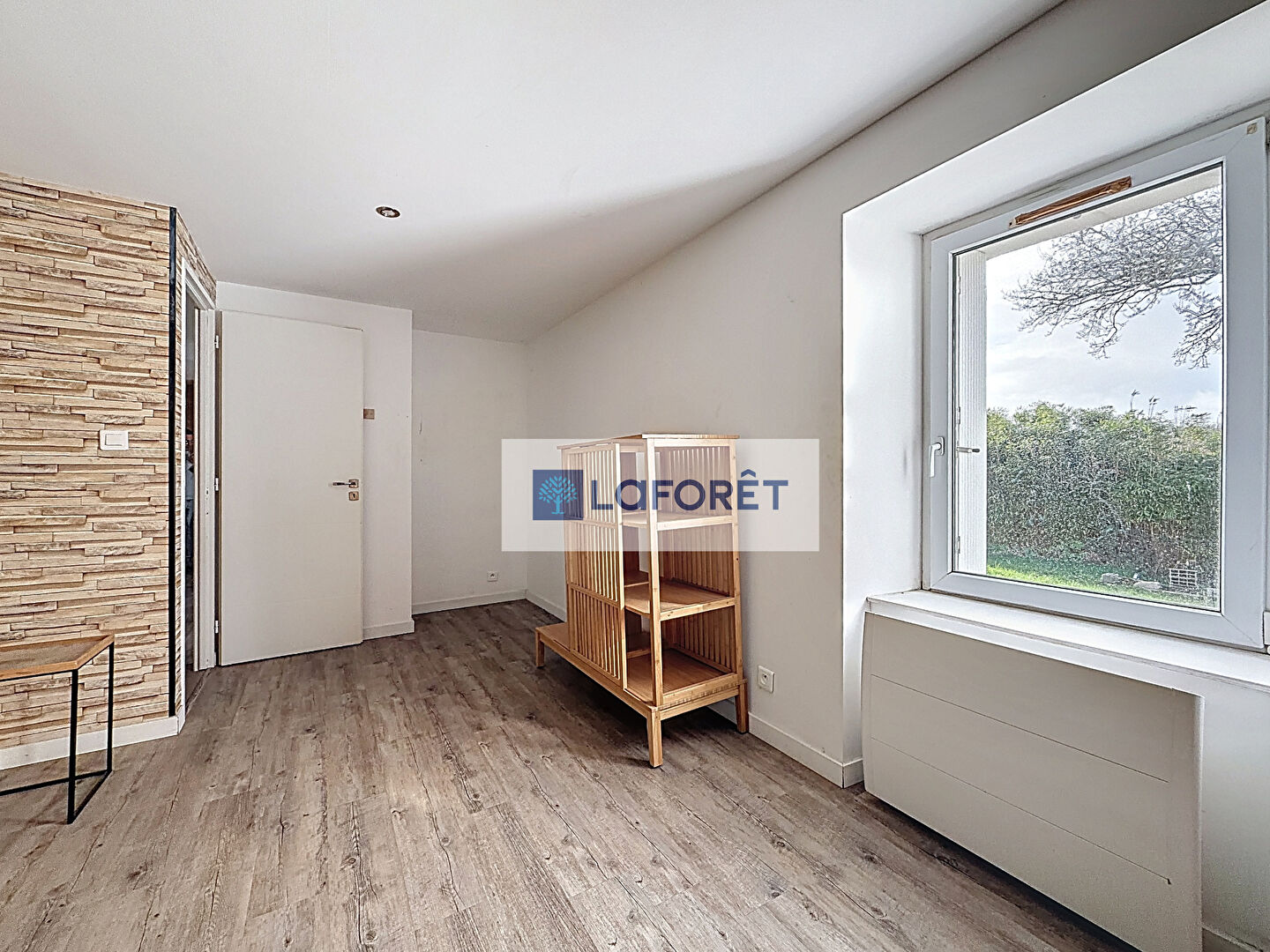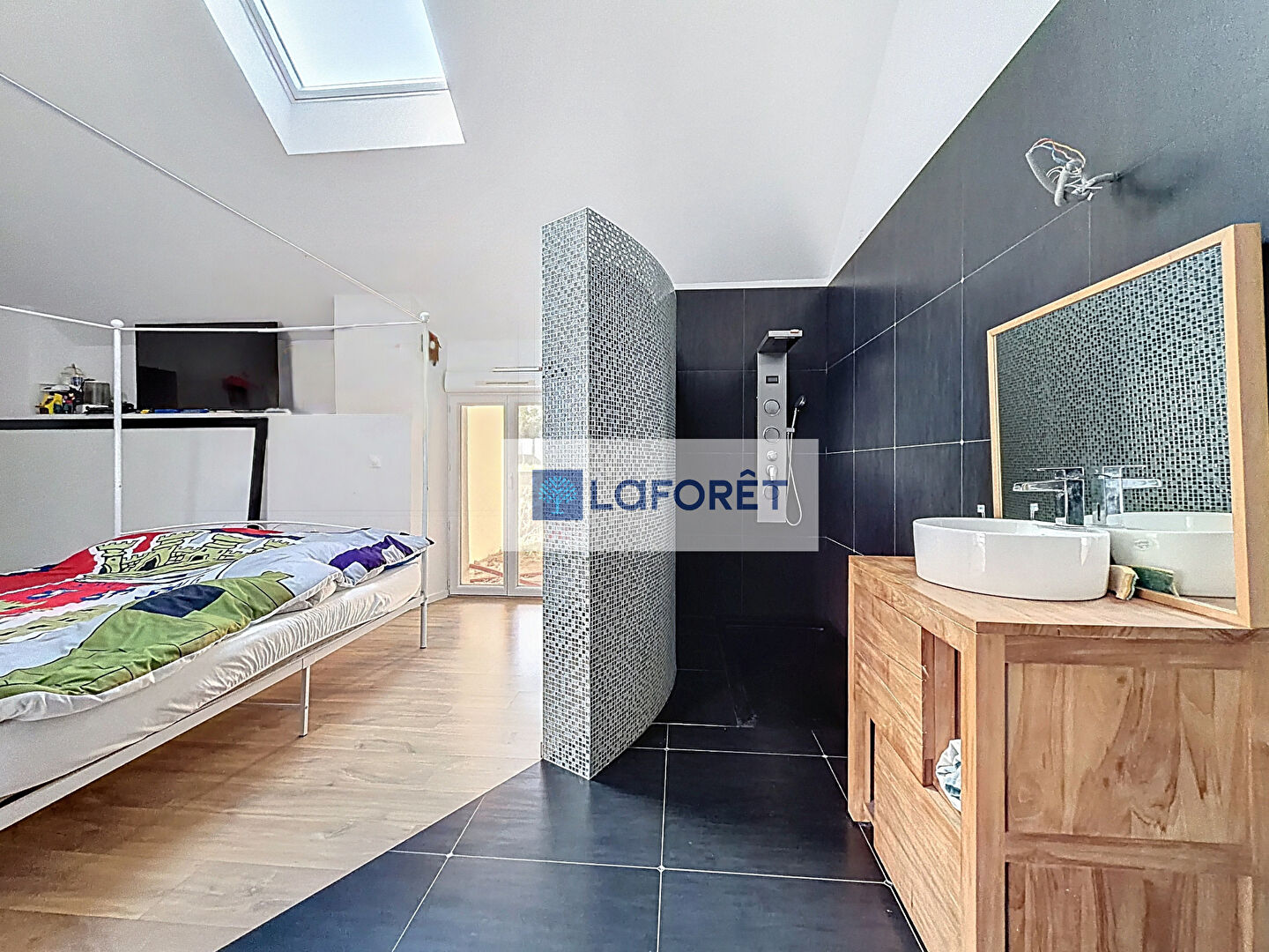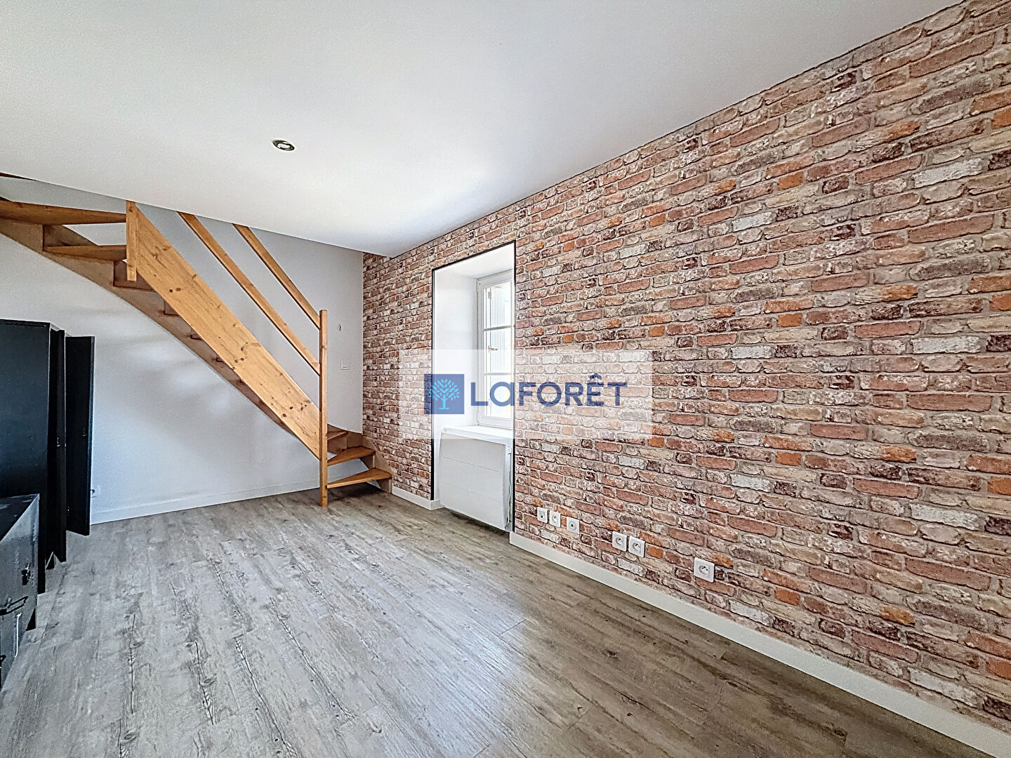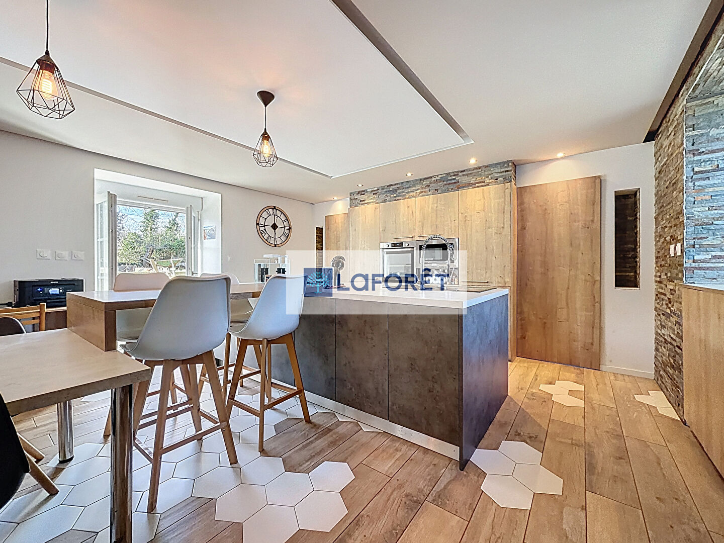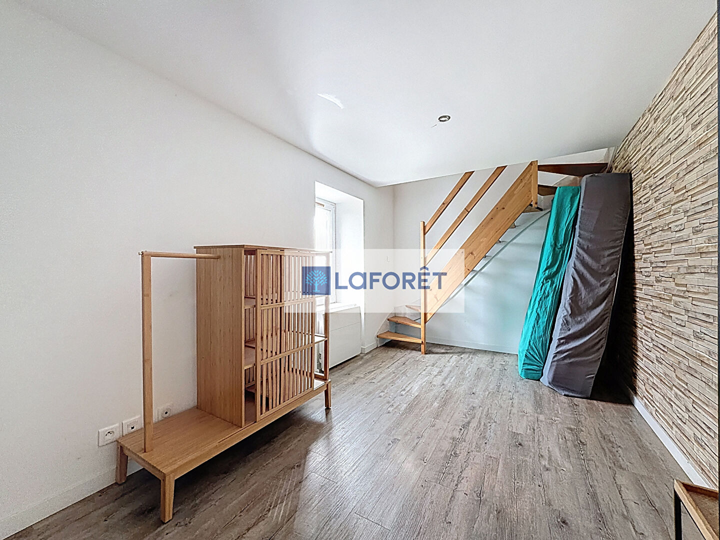 Une grande pièce de vie, ouverte sur une cuisine aménagée et équipée + un espace buanderie.