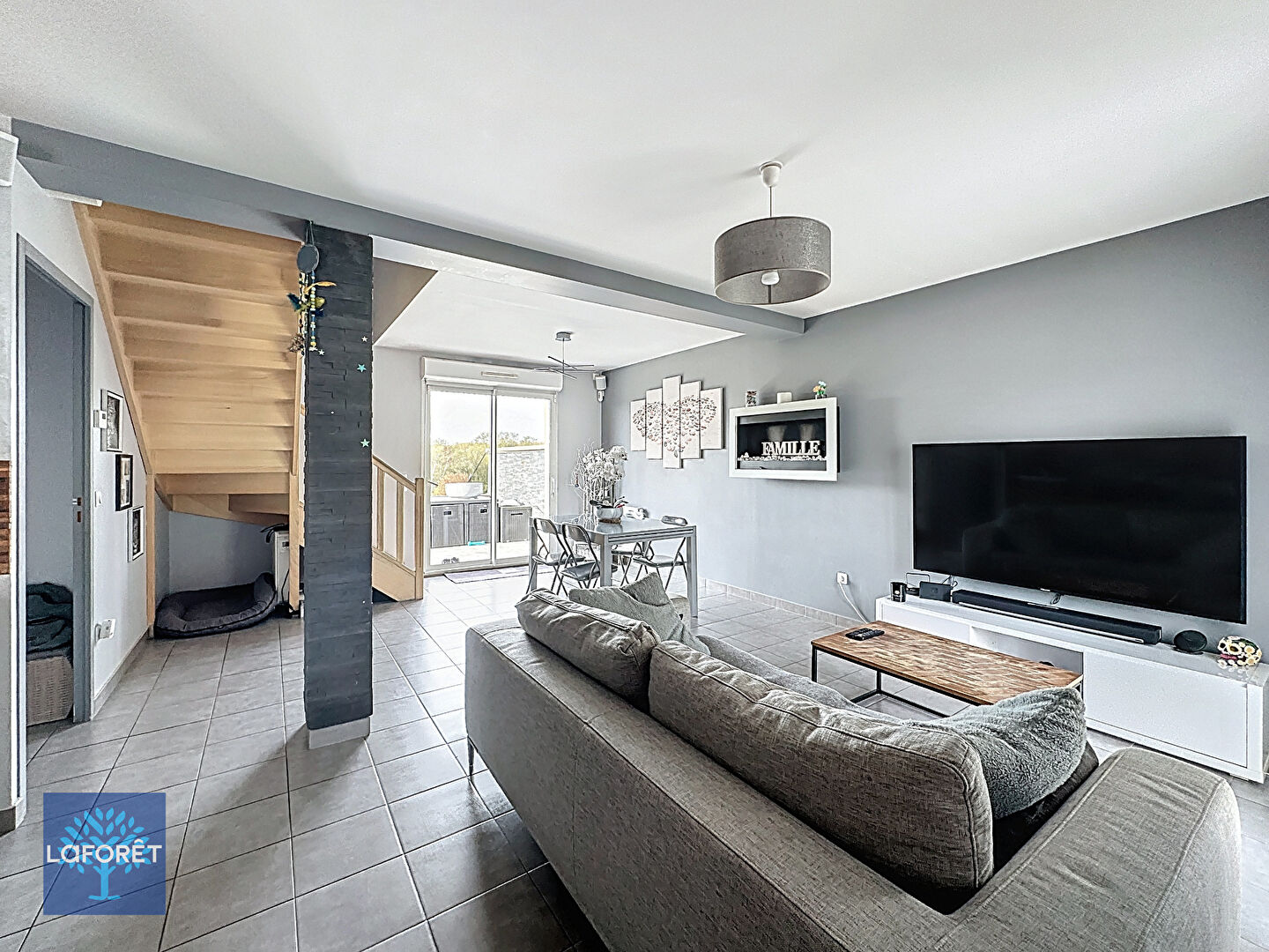 - au rez-de-chaussée : entrée sur pièce à vivre avec cuisine ouverte, dégagement, salle d'eau avec WC, cellier et garage.
