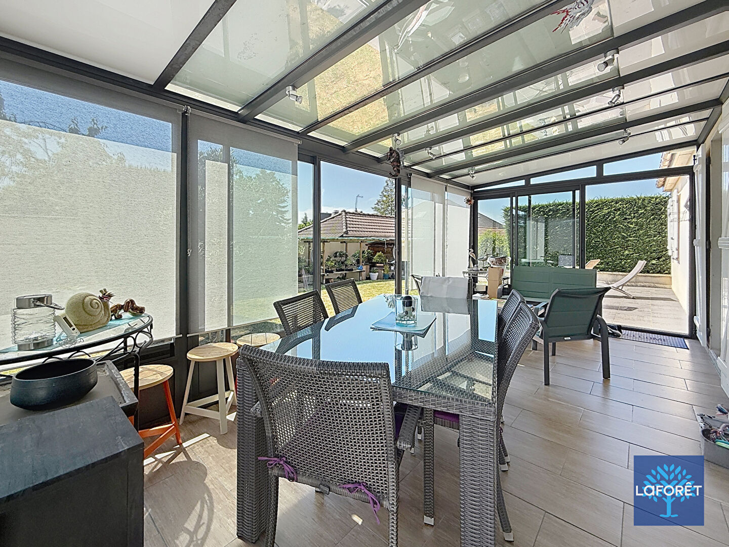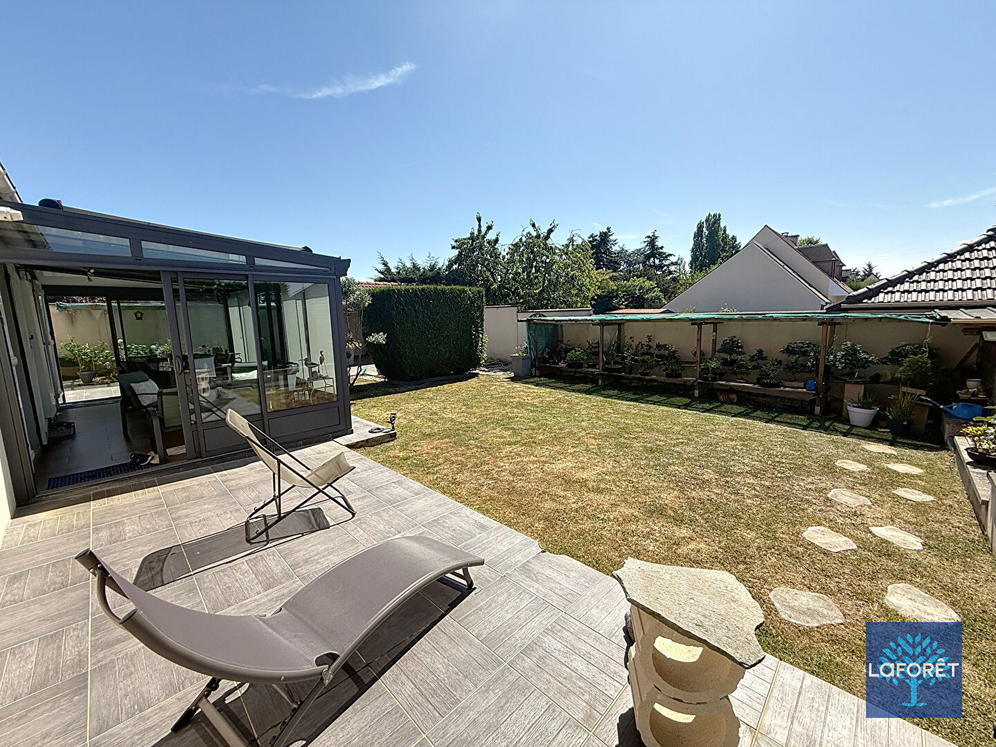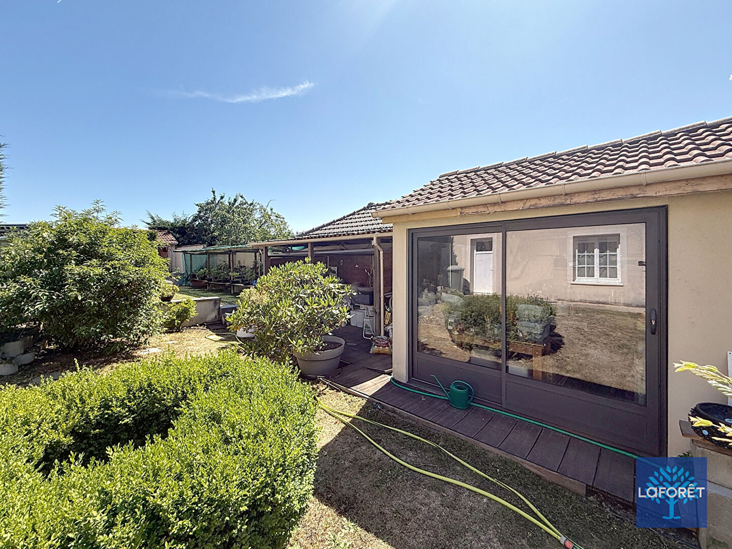 Le terrain de 787m2, sans aucun vis-à-vis, est un véritable espace de vie extérieur. Vous y trouverez plusieurs abris ouverts pratiques, un chalet de jardin, un atelier carrelé, ainsi qu'une serre pour les amateurs de jardinage.