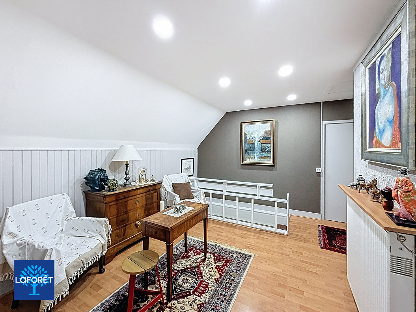 A l'étage: pièce palière idéale pour un espace de jeux ou bibliothèque, un débarras, un bureau, et deux belles chambres dont une magnifique par sa taille de 50m2!