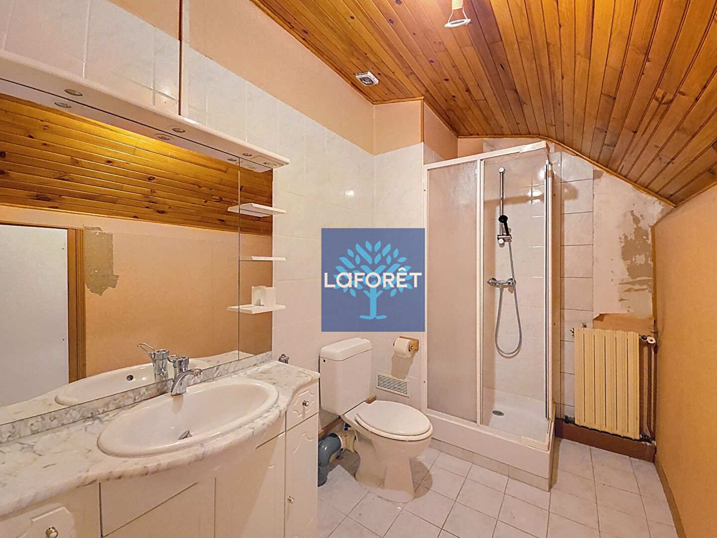 A l'étage: une chambre, une salle d'eau avec wc et de beaux espaces (combles) à aménager selon vos besoins (chambres, bureaux, salle de jeux...).