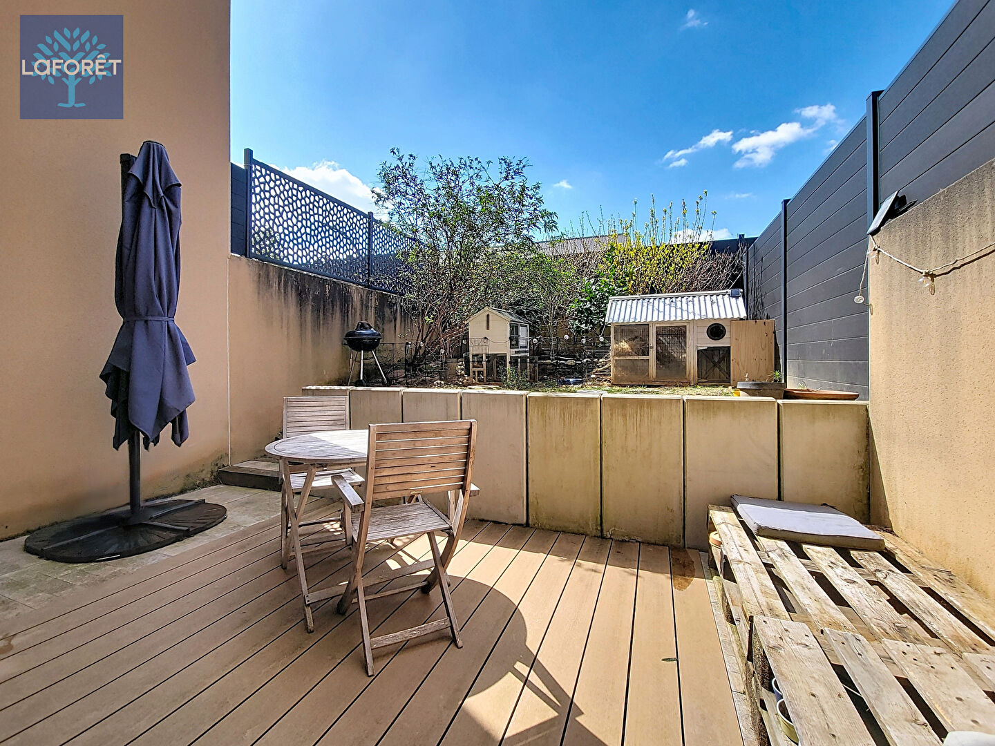 Au rez-de-chaussée, une pièce de vie traversante et lumineuse de 30 m² avec cuisine américaine équipée s'ouvre sur une terrasse de 15 m² et un jardin de 21 m², sans vis-à-vis, offrant un espace extérieur agréable et intimiste.