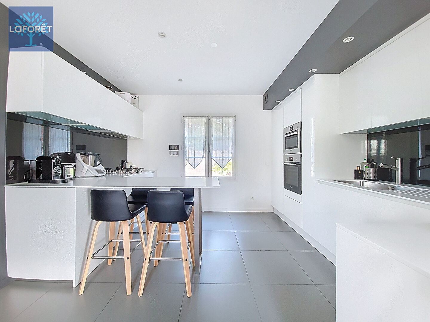 Au rez-de-chaussée, vous profiterez d'une magnifique entrée déplafonnée, donnant sur séjour et cuisine américaine, entièrement équipée, de deux chambres, dont une avec salle d'eau, d'un wc et d'une buanderie.