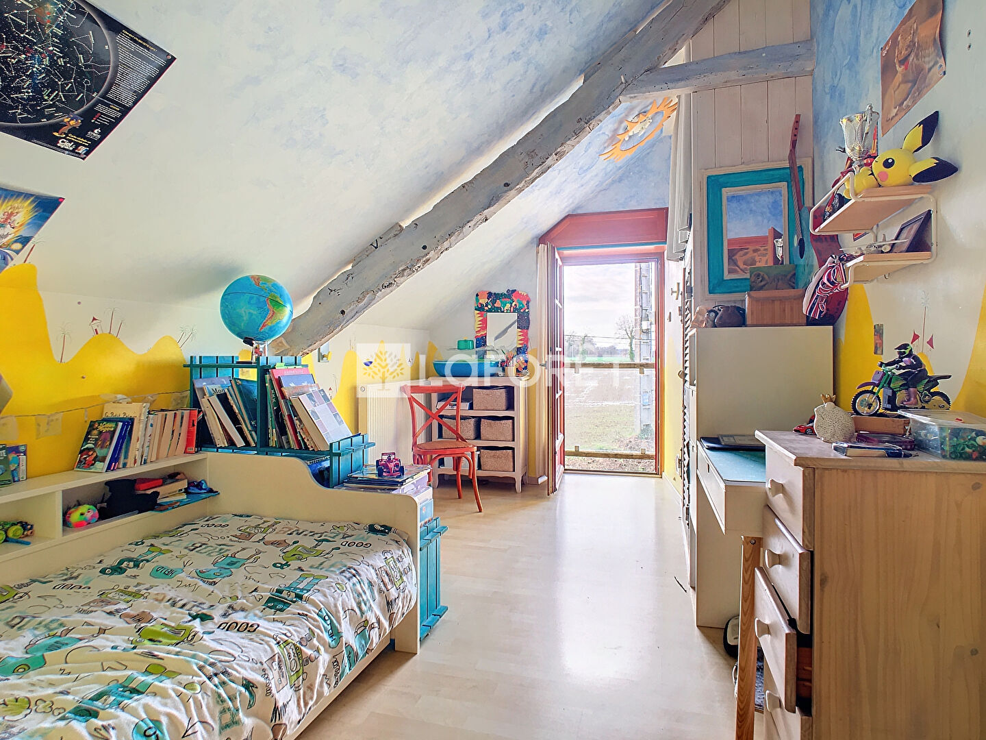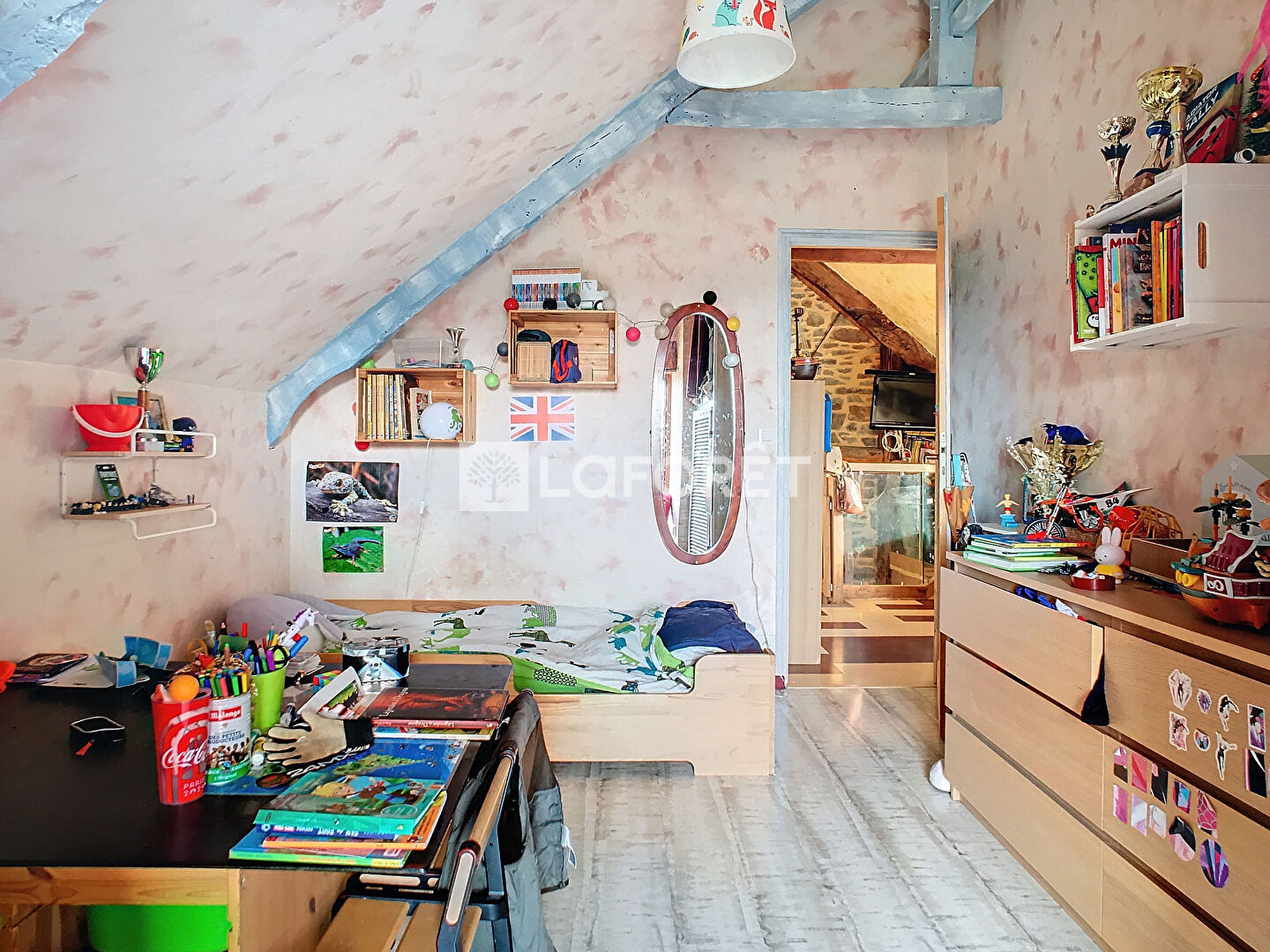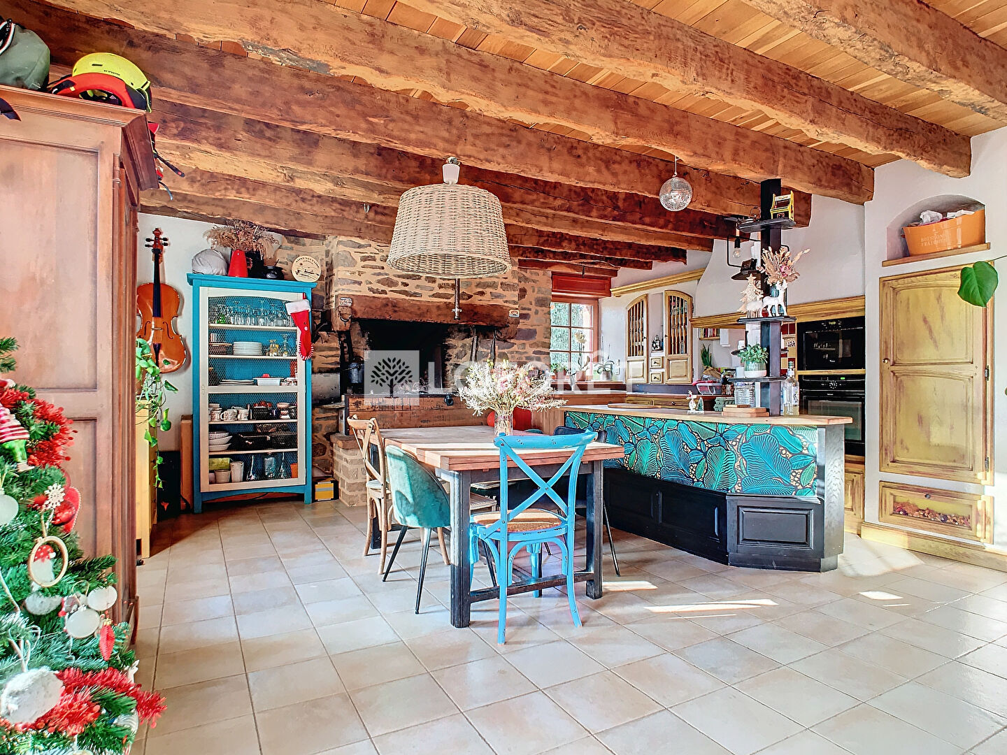 Au rez-de-chaussée, vous trouverez une cuisine aménagée et équipée, un salon-séjour lumineux avec une grande cheminée typique, ainsi qu'une buanderie et un wc. À l'étage, une mezzanine vous offre un espace idéal pour un bureau ou un coin détente, deux chambres avec de nombreux rangements complètent et une salle de bains avec douche et baignoire d'angle et wc