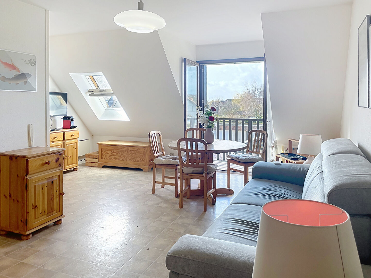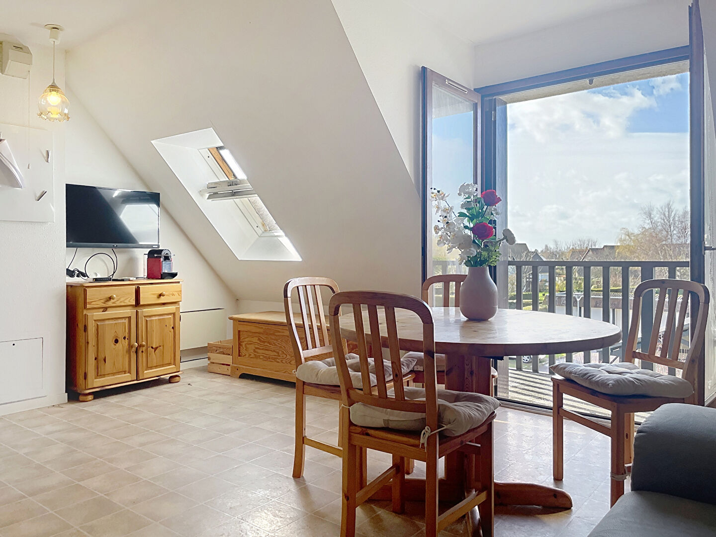 Le séjour avec cuisine ouverte dispose d'une belle luminosité et d'une surface totale de 22,14 m² (25,96 m² au sol) et d'un balcon exposé OUEST et sans vis-à-vis. La chambre de 5,85m² dispose de 8,6m² au sol, salle de bains et WC séparé.