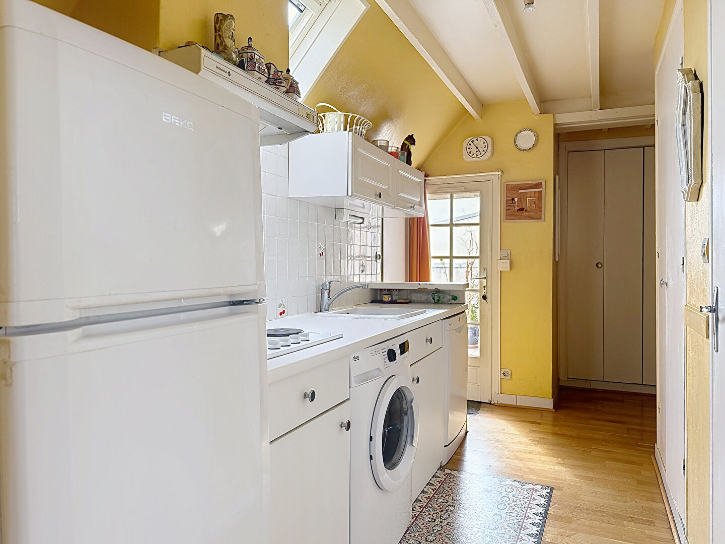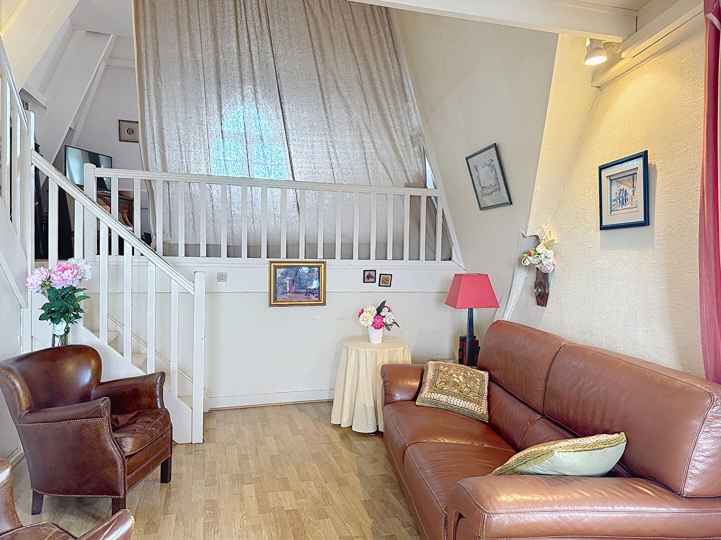 Au premier niveau, on trouve une entrée avec un grand placard, une cuisine aménagée et équipée avec accès au balcon de 6m2 exposé Sud, une salle de bain, un WC et un grand séjour de 18m2 doté d'une triple exposition. Du séjour, on accède par quelques marches à une chambre en mezzanine ouverte sur le séjour. A l'étage, on trouve deux petites chambres sous combles et un WC avec lave-mains.