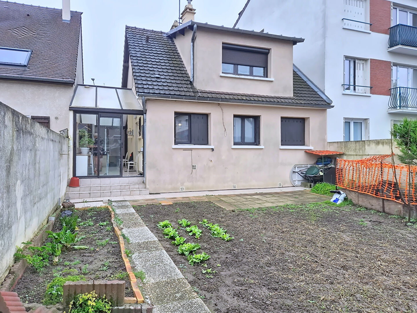 Elle se compose d'un double séjour, d'une cuisine indépendante, de deux chambres, d'une salle d'eau, de WC séparés et d'une véranda sur un jardin.