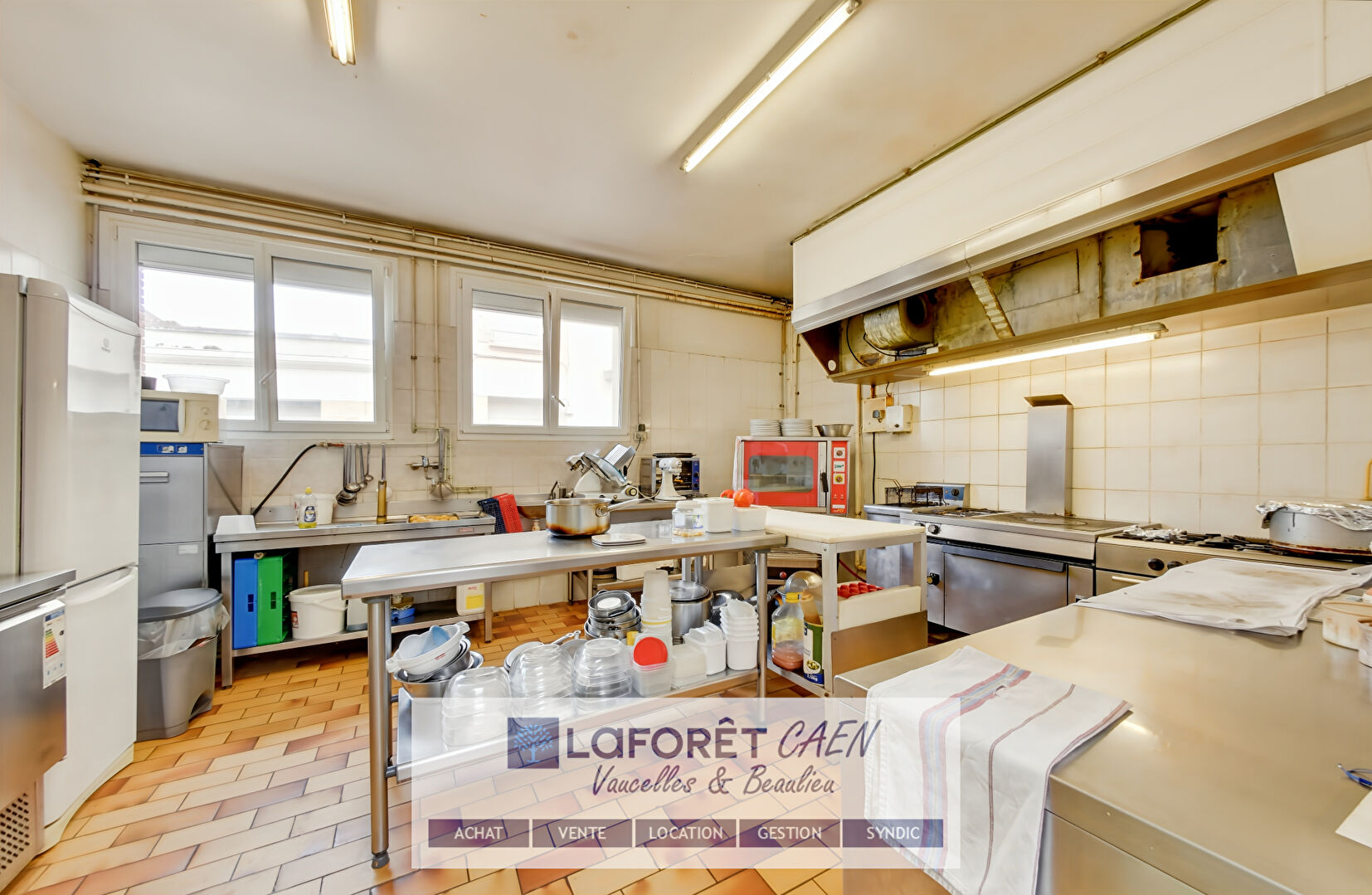 Un grand couloir va desservir l'espace cuisine, une arrière cuisine, une cour donnant sur une chambre froide, un espace bureau, une grande cave de stockage, un garage, un second WC et enfin une grande salle de réception/restauration de 75m² avec son accès indépendant sur la rue.