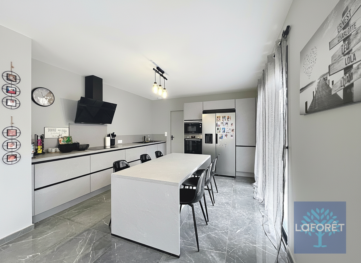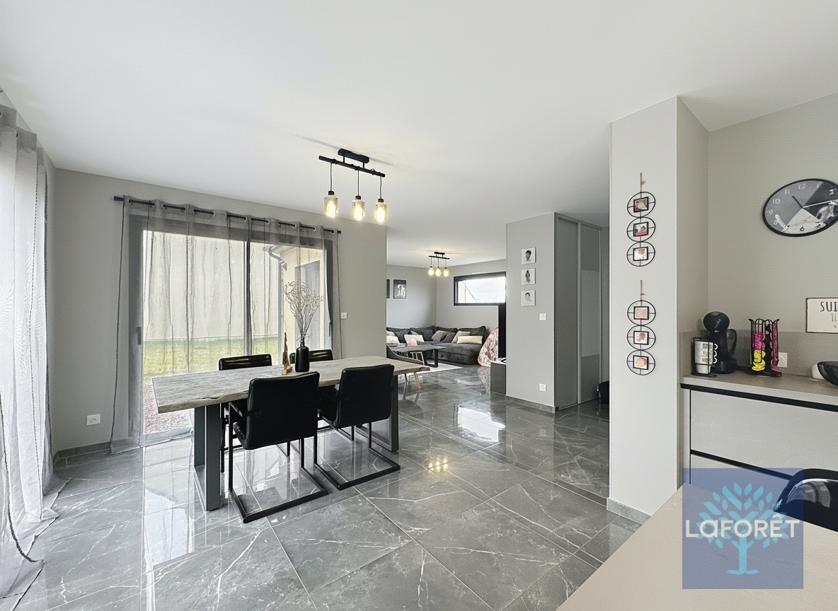 D'une surface de 128m2, elle offre une vraie vie de plain pied avec sa suite parentale (Chambre, placard-dressing et salle d'eau) . Le rdc se poursuit avec une très grande pièce de vie de 47m2 proposant un salon cosy, un séjour et une cuisine ouverte Ixina toute équipée. Un wc, un garage et un cellier complète ce niveau.