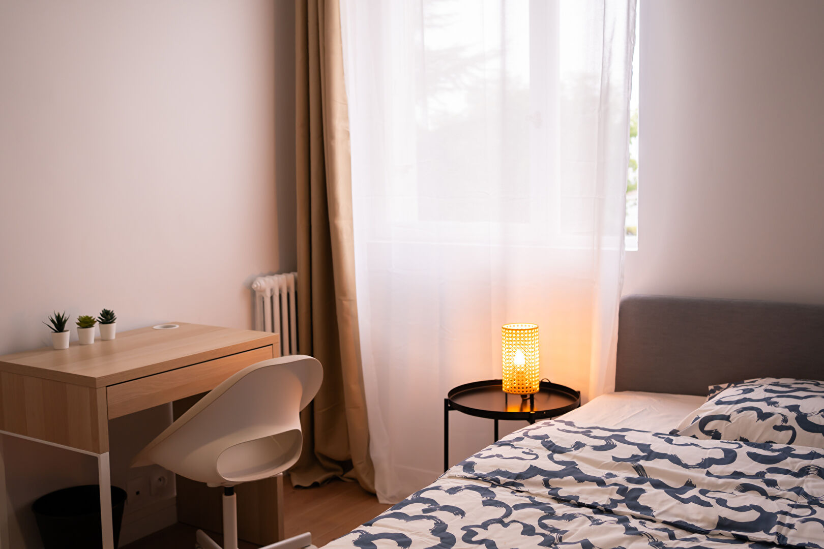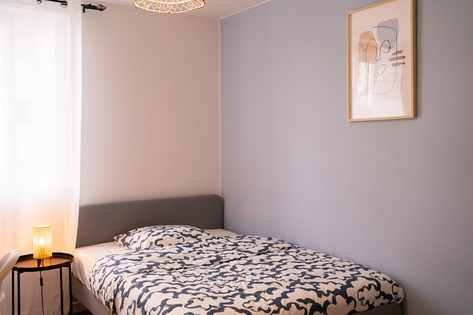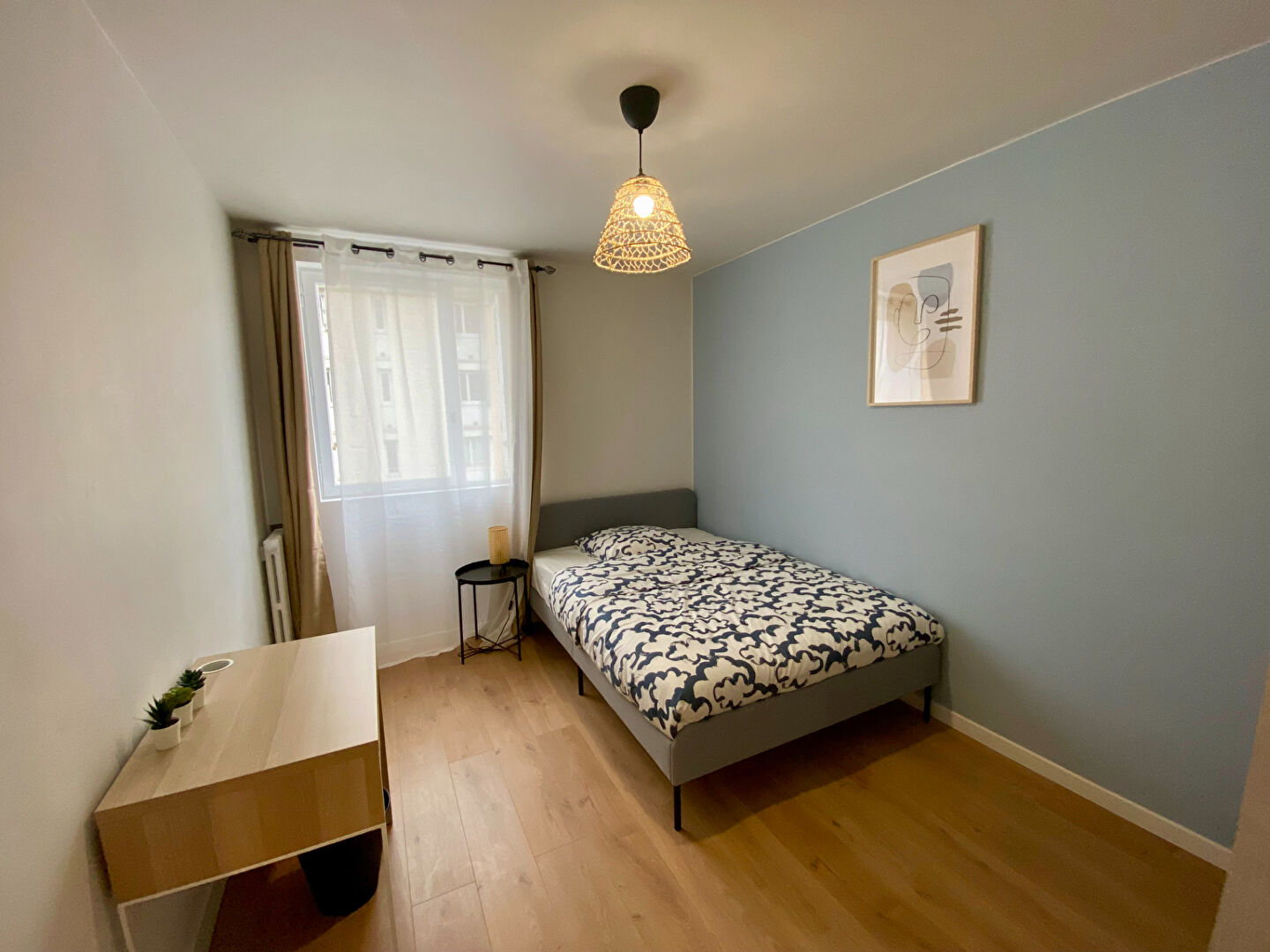 Il se compose d'une entrée, un couloir avec placard, un séjour avec balcon, une cuisine aménagée et équipée, 2 salle d'eau, wc, chambre (n°4) d'une superficie de 11m² située au fond du couloir à gauche, elle dispose d'un lit double, un bureau et un petit dressing .