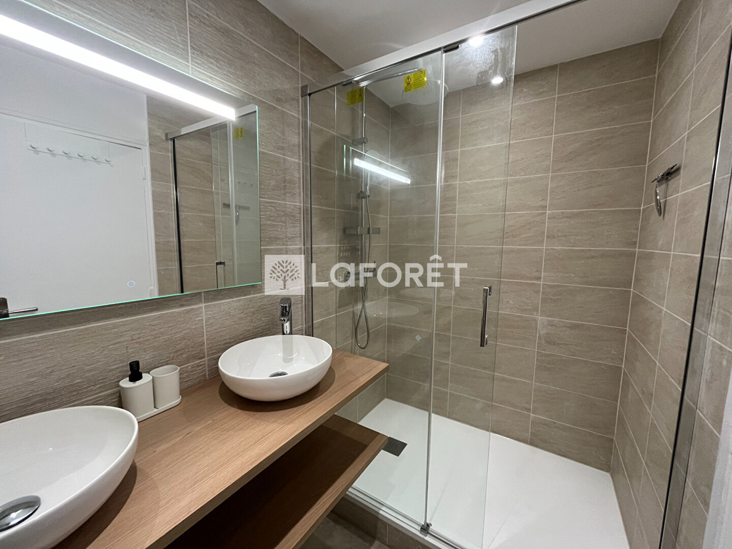 Salle d'eau avec double vasques, WC séparés. Nombreux rangements communs.