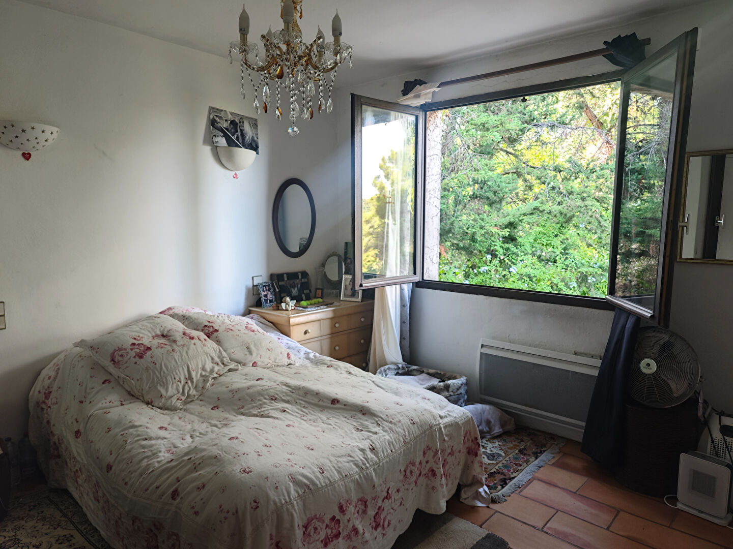 Peu d'entretien au niveau jardin car une grande partie est boisée, en dévers. Possibilité de garer plusieurs voitures aussi à l'extérieur. Arrêt de bus devant la maison.