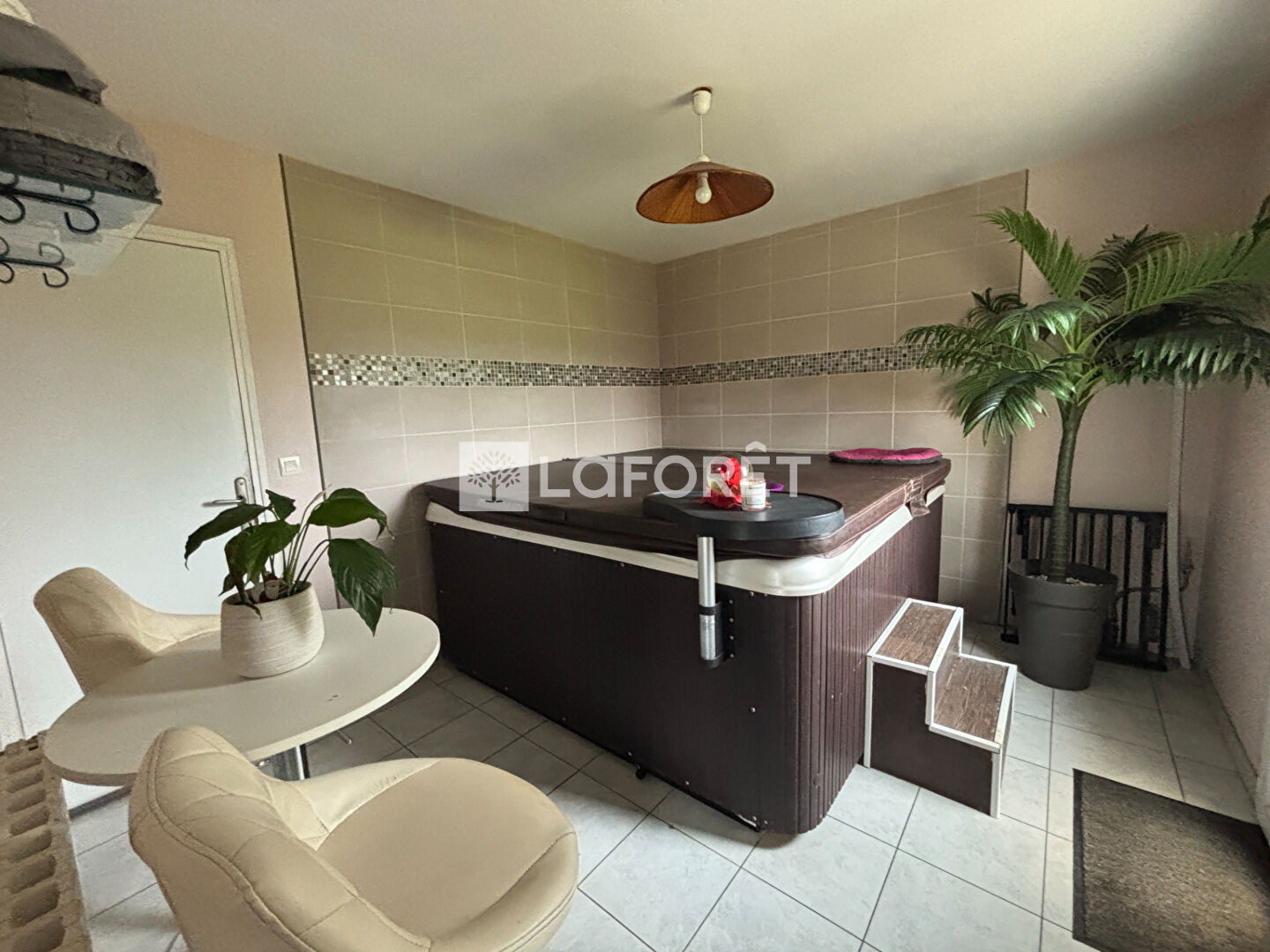 Elle se compose au rez-de-chaussée d'une entrée avec placard, d'une cuisine aménagée et équipée ouverte sur un vaste séjour-salon agrémenté d'un poêle à bois, d'une chambre avec salle d'eau privative ainsi que d'un WC. Une pièce dédiée avec jacuzzi vient compléter ce niveau.