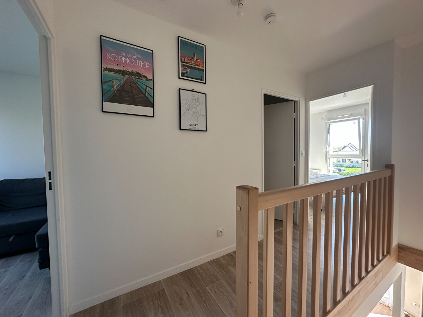 En parfait état, elle se compose au rez-de-chaussée, d'une entrée, d'une lumineuse pièce de vie avec accès à la terrasse, d'une cuisine ouverte aménagée et toute équipée, d'un wc indépendant buanderie et un placard. A l'étage vous trouverez un palier desservant deux chambres, et d'une salle d'eau avec wc.
