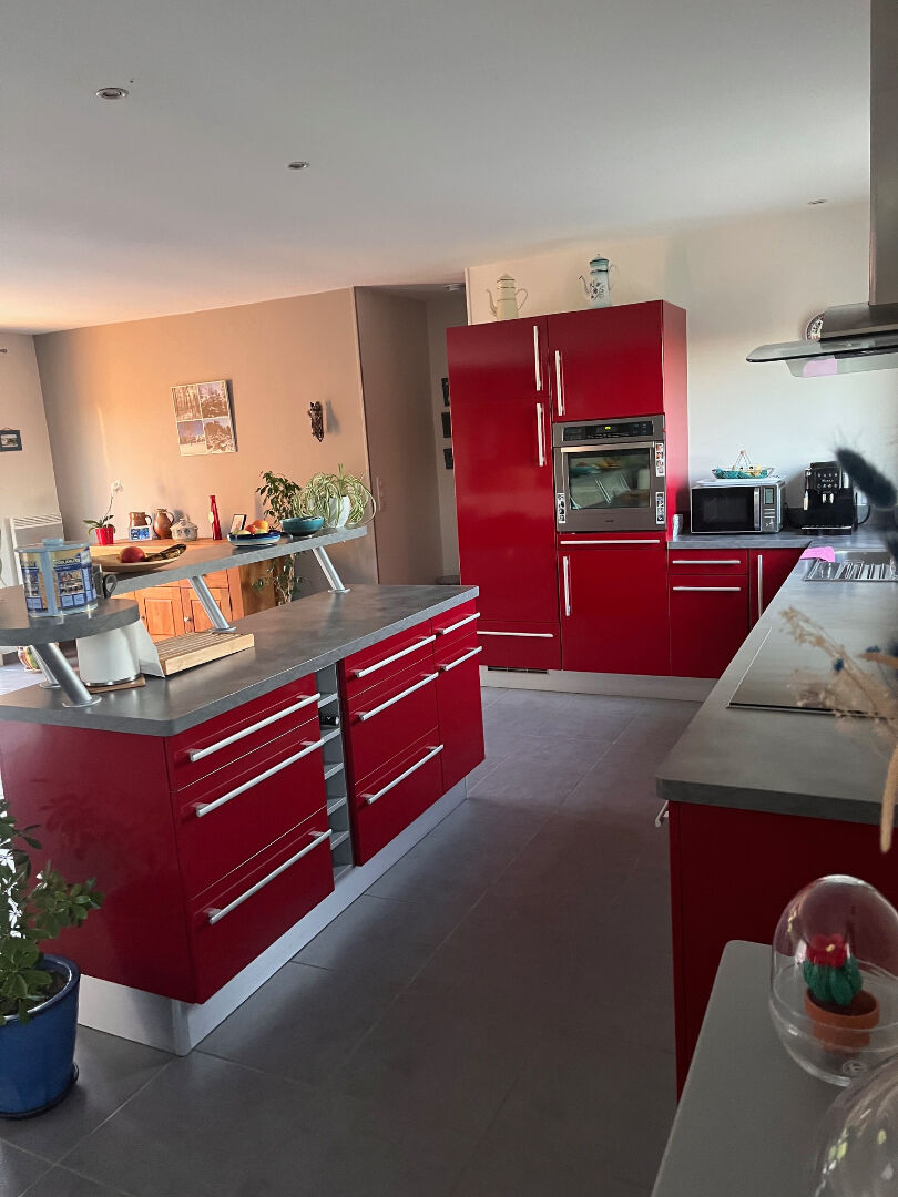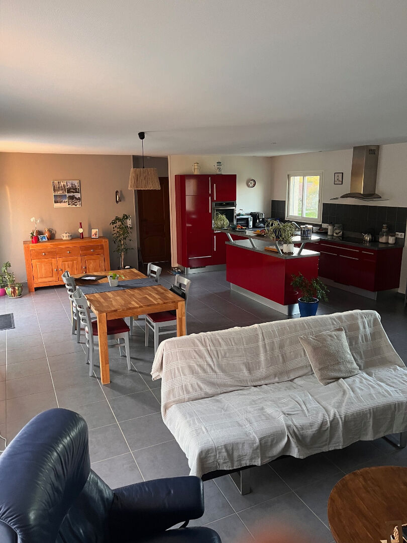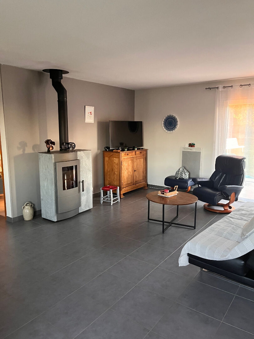 Entrée sur un lumineux salon séjour de 63m² équipé d'un poêle a bois et pellets, avec cuisine ouverte aménagée et toute équipée.