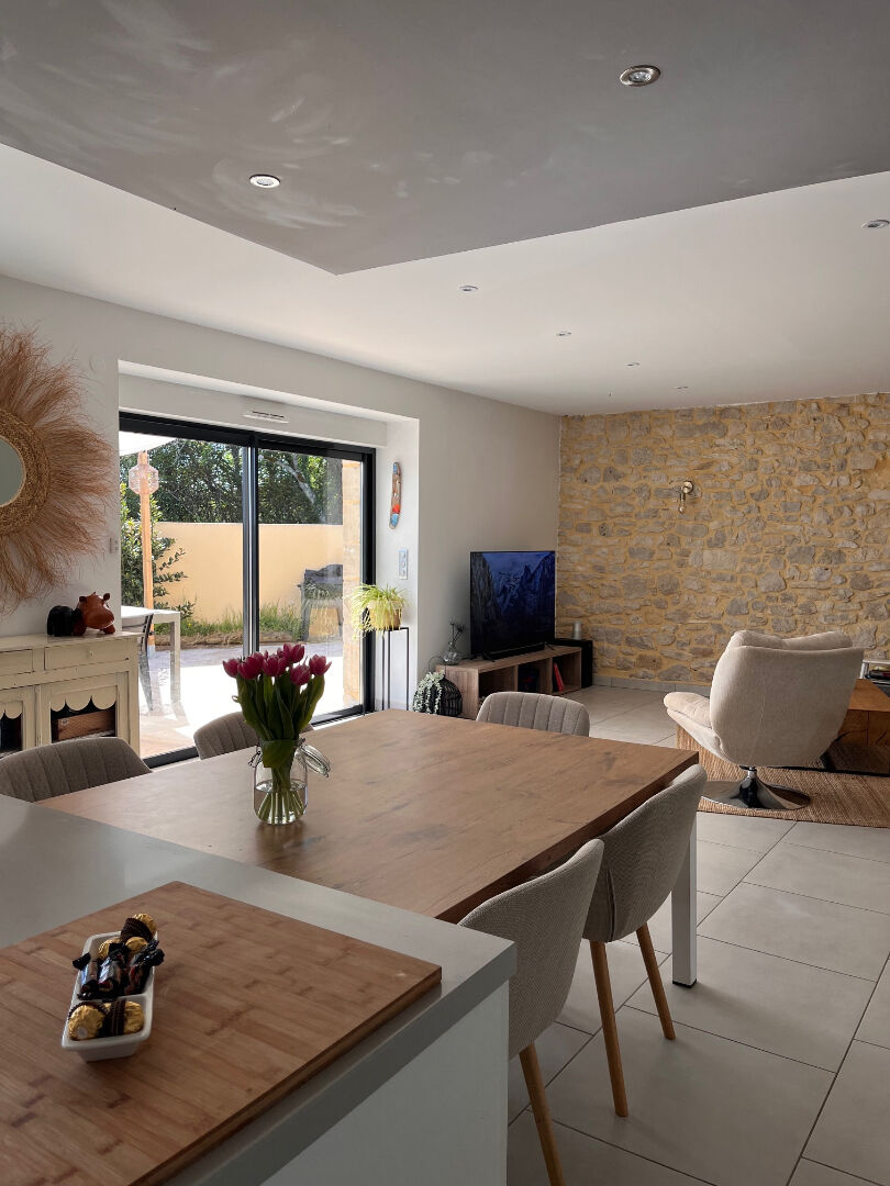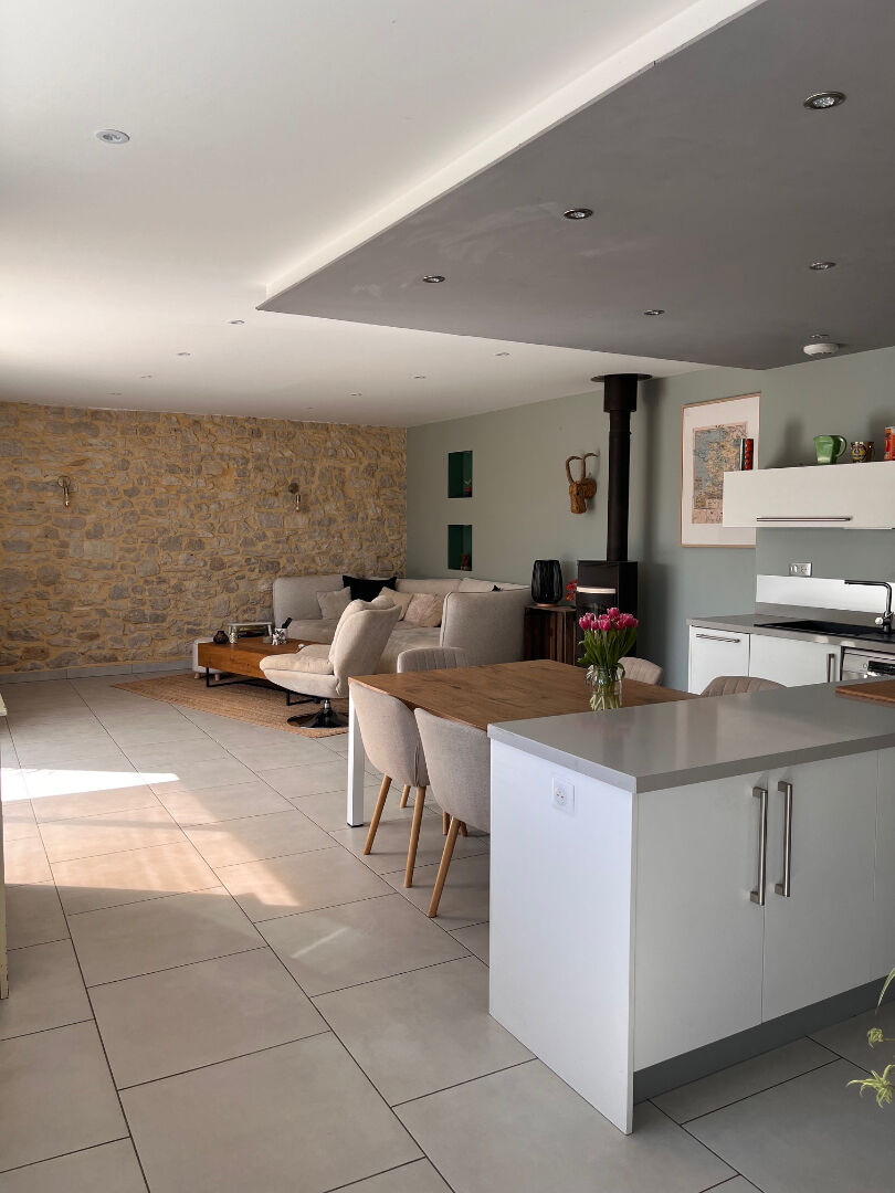La pièce de vie baigne dans la lumière avec sa terrasse intimiste.