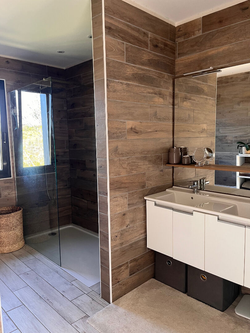 Cuisine aménagée et buanderie, wc , 3 belles chambres, une salle de bains en travertin avec douche italienne et baignoire,