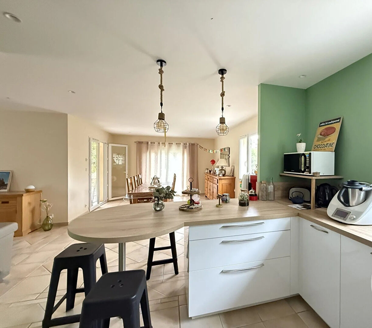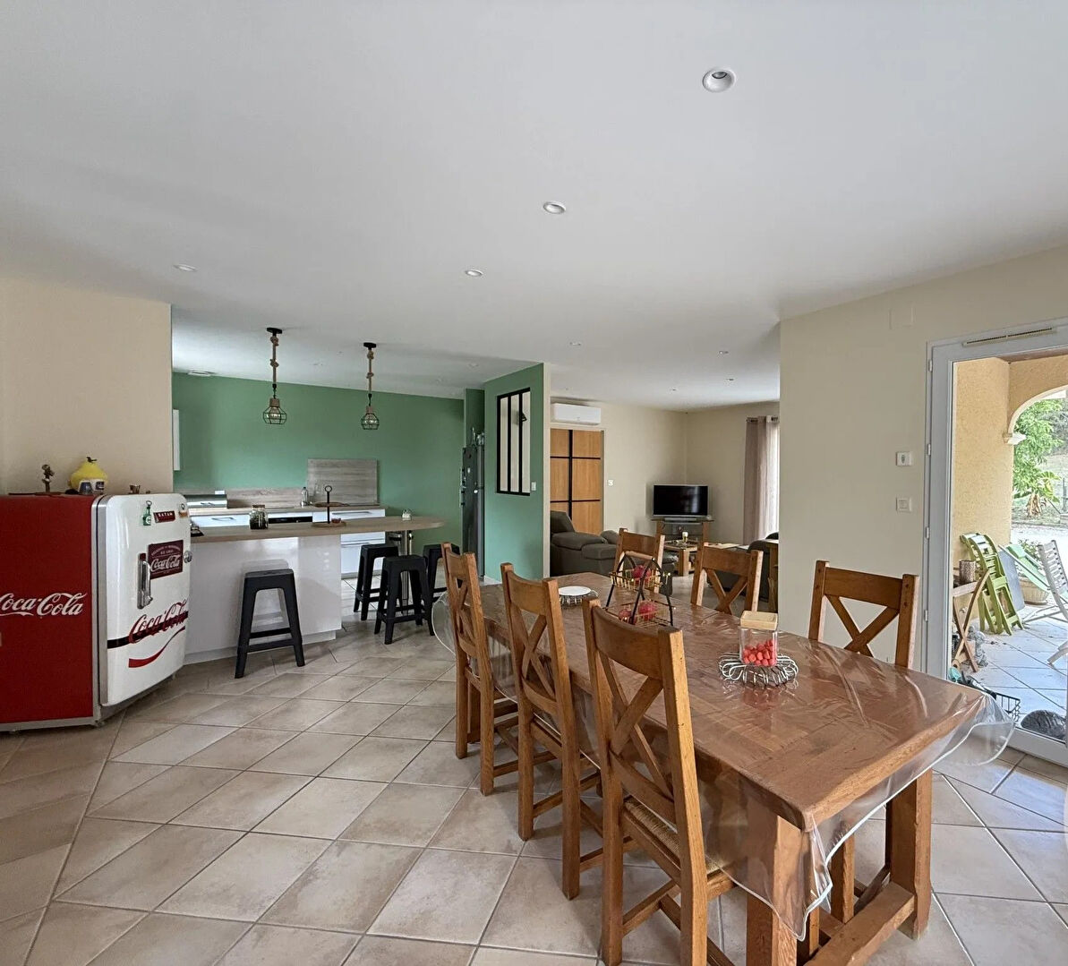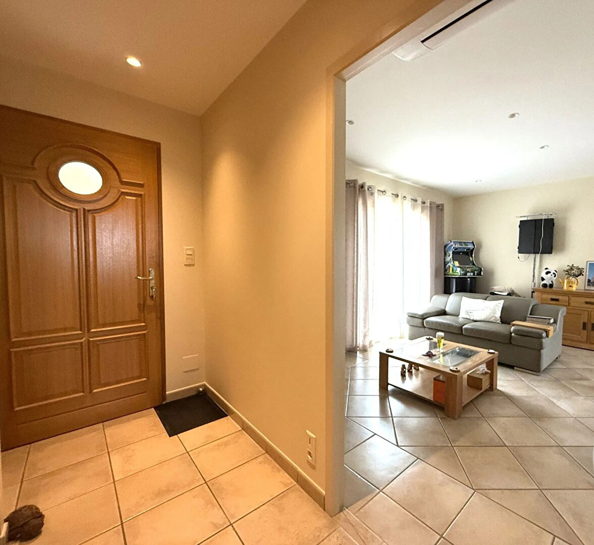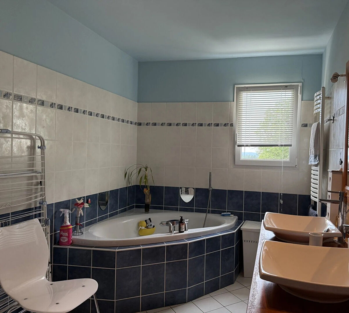 Chauffage au sol par une PAC ( air/eau) clim réversible, volets roulants électriques.