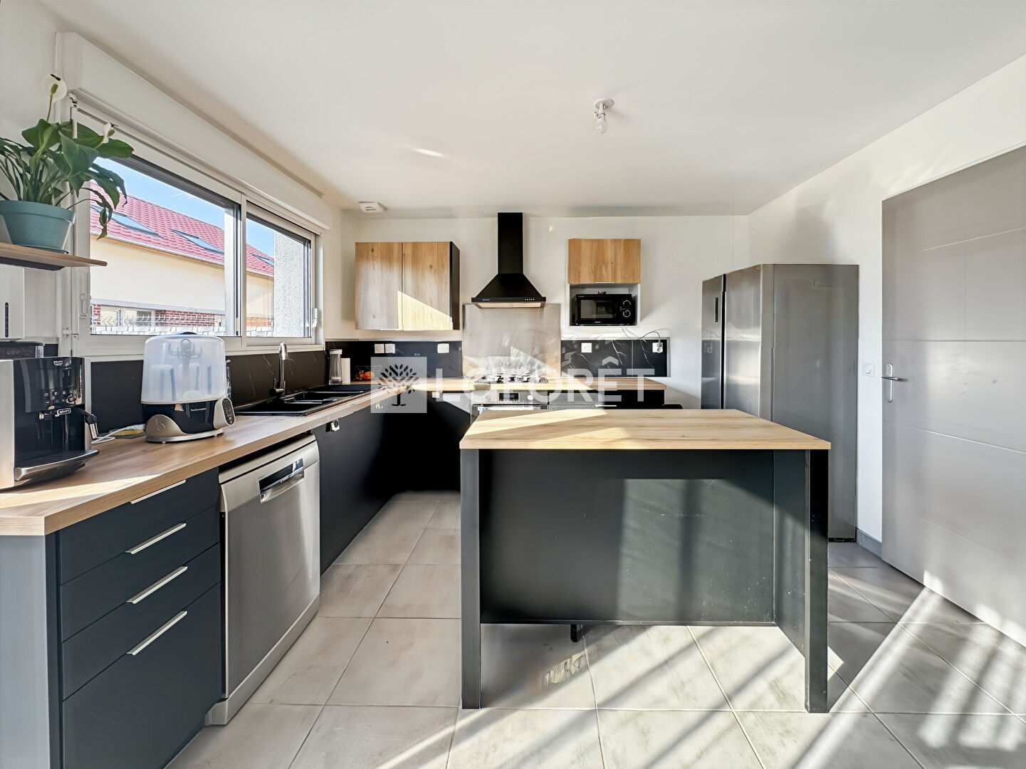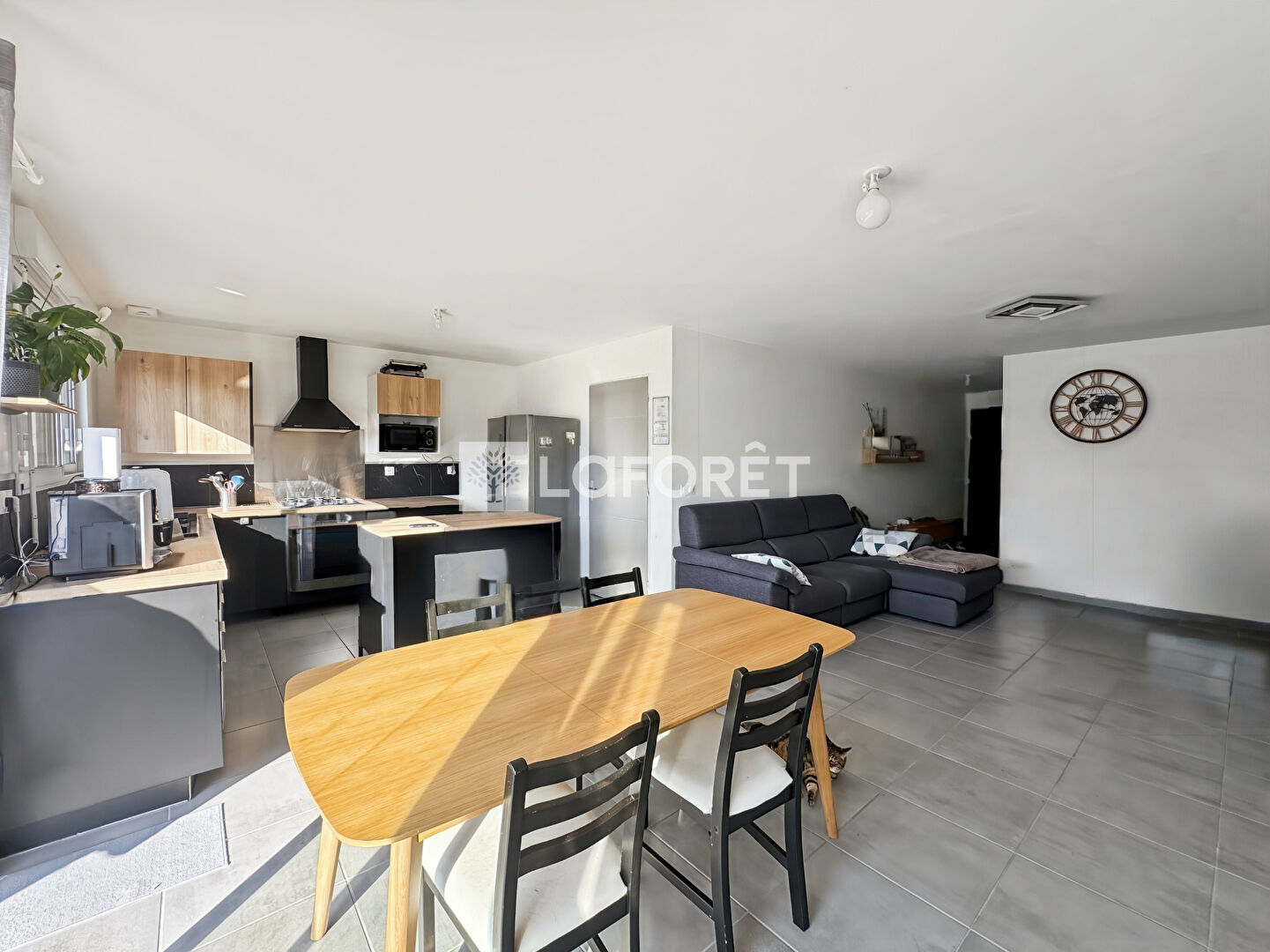 La pièce de vie, conviviale et lumineuse, bénéficie d'une belle clarté naturelle. L'agencement a été pensé pour répondre aux normes RT 2021 et assurer une circulation fluide entre les espaces. La cuisine, aménagée, s'intègre harmonieusement à l'ensemble.
