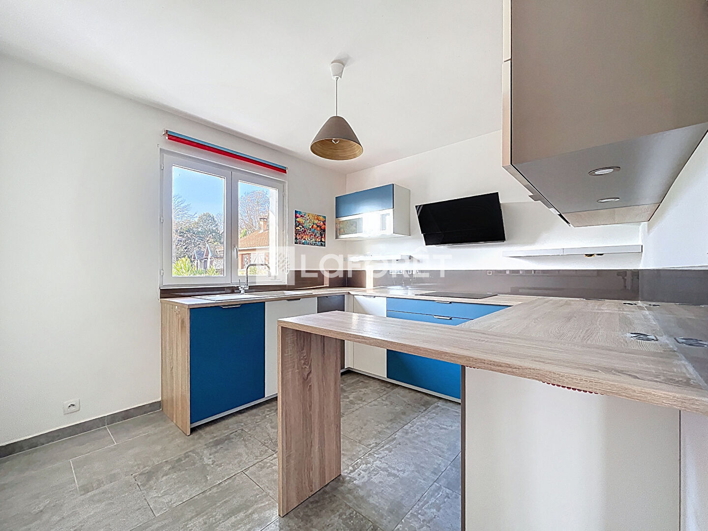 À l'étage, la maison s'ouvre sur un vaste salon-séjour baigné de lumière de plus de 46 m², donnant directement sur un balcon-terrasse où il fait bon se détendre. La cuisine entièrement équipée offre confort et convivialité au quotidien. Deux autres chambres avec placards, une salle d'eau moderne et un WC séparé complètent ce niveau.