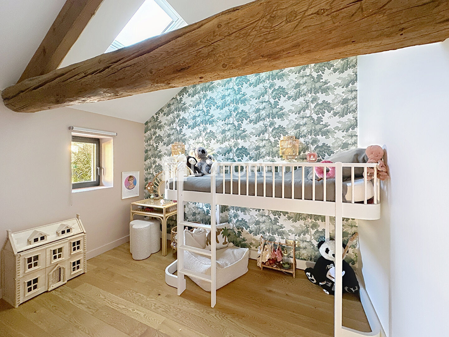 Le dernier étage est dédié aux enfants, avec ses deux chambres et leurs poutres apparentes, ainsi qu'une salle de bain et des WC séparés.