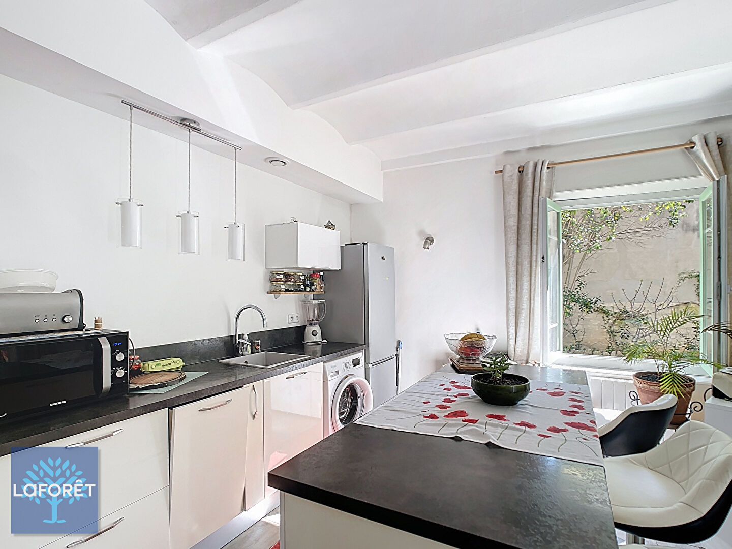 L'appartement offre un vaste séjour baigné de lumière, prolongé par une cuisine ouverte aménagée et équipée pour un quotidien pratique et convivial.