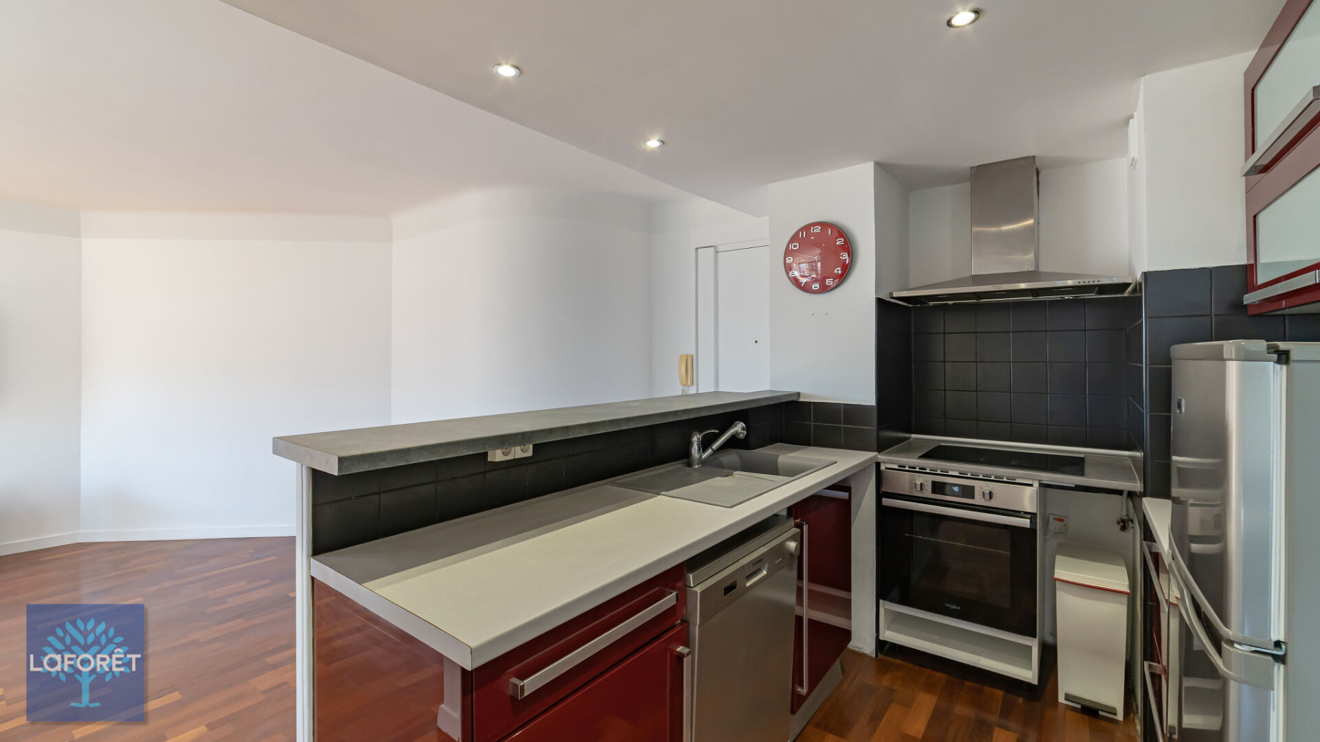 La cuisine américaine est aménagée et équipée, ouverte sur la pièce de vie. Le bien comprend deux chambres avec placards intégrés, une salle de bains et de nombreux rangements.