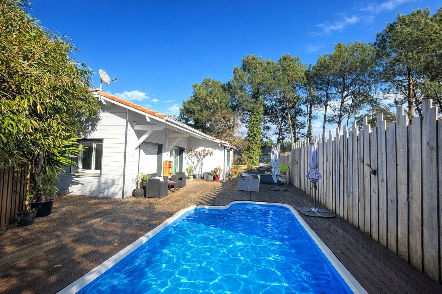 Le vrai plus, une belle terrasse exposée SUD-OUEST donnant sur une piscine chauffée de 7 x 3.7 m.