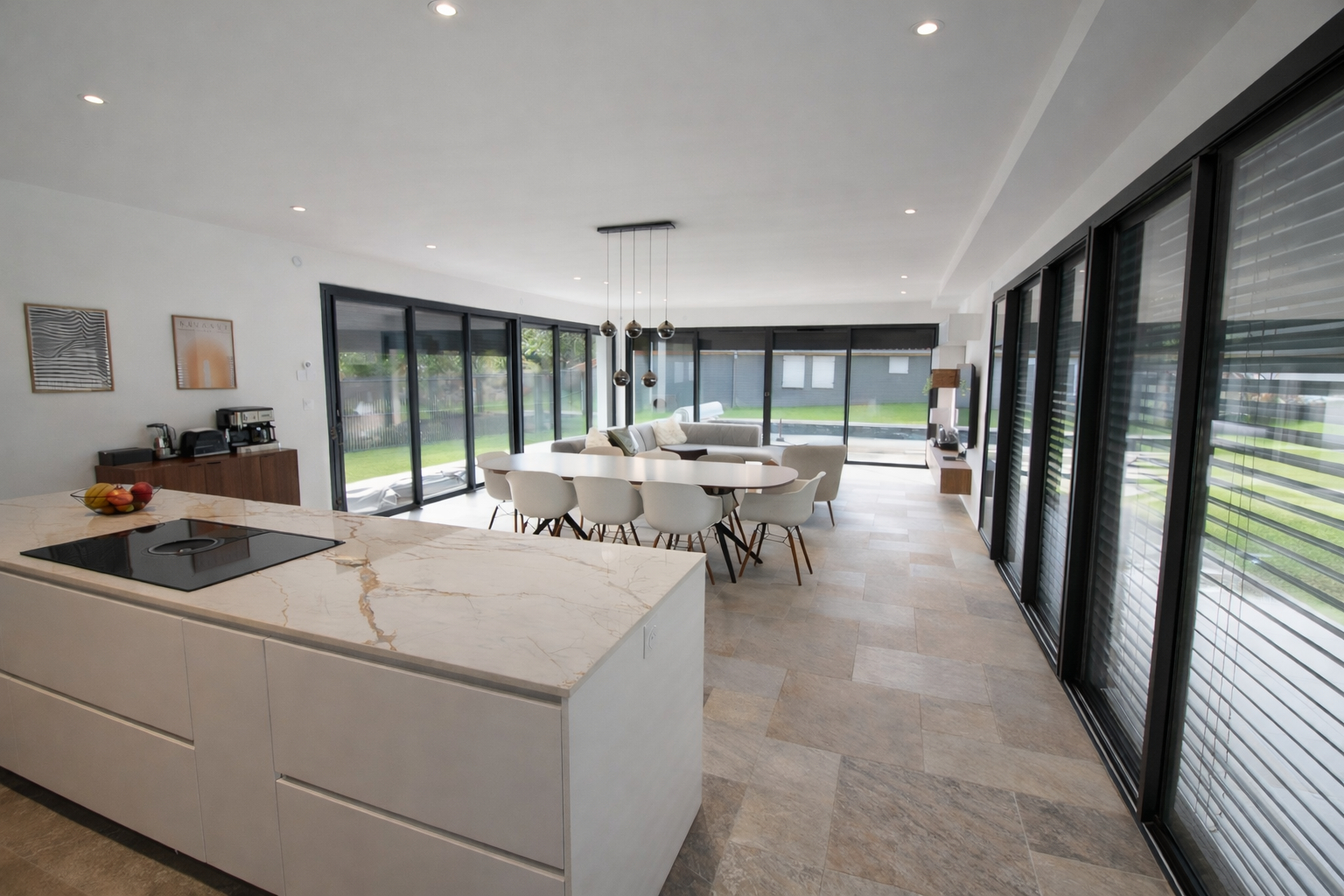 Dès l'entrée, vous découvrirez un vaste séjour baigné de lumière, ouvert sur une cuisine moderne et conviviale, offrant un espace de vie idéal pour recevoir.
