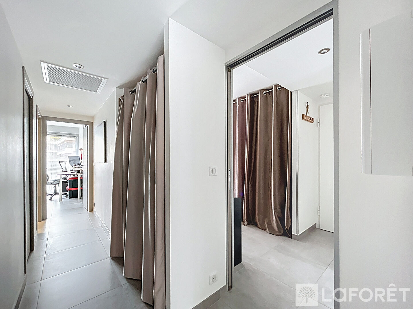 Les intérieurs dévoilent une atmosphère chaleureuse et contemporaine, où se mêlent peintures blanches, carrelage gris effet ciment et touches de bois, pour une élégance sobre et intemporelle. On apprécie également son agencement réfléchi et optimisé par de nombreux rangements : deux chambres (10m² en), séjour (22m²), couloir et hall d'entrée avec placard?