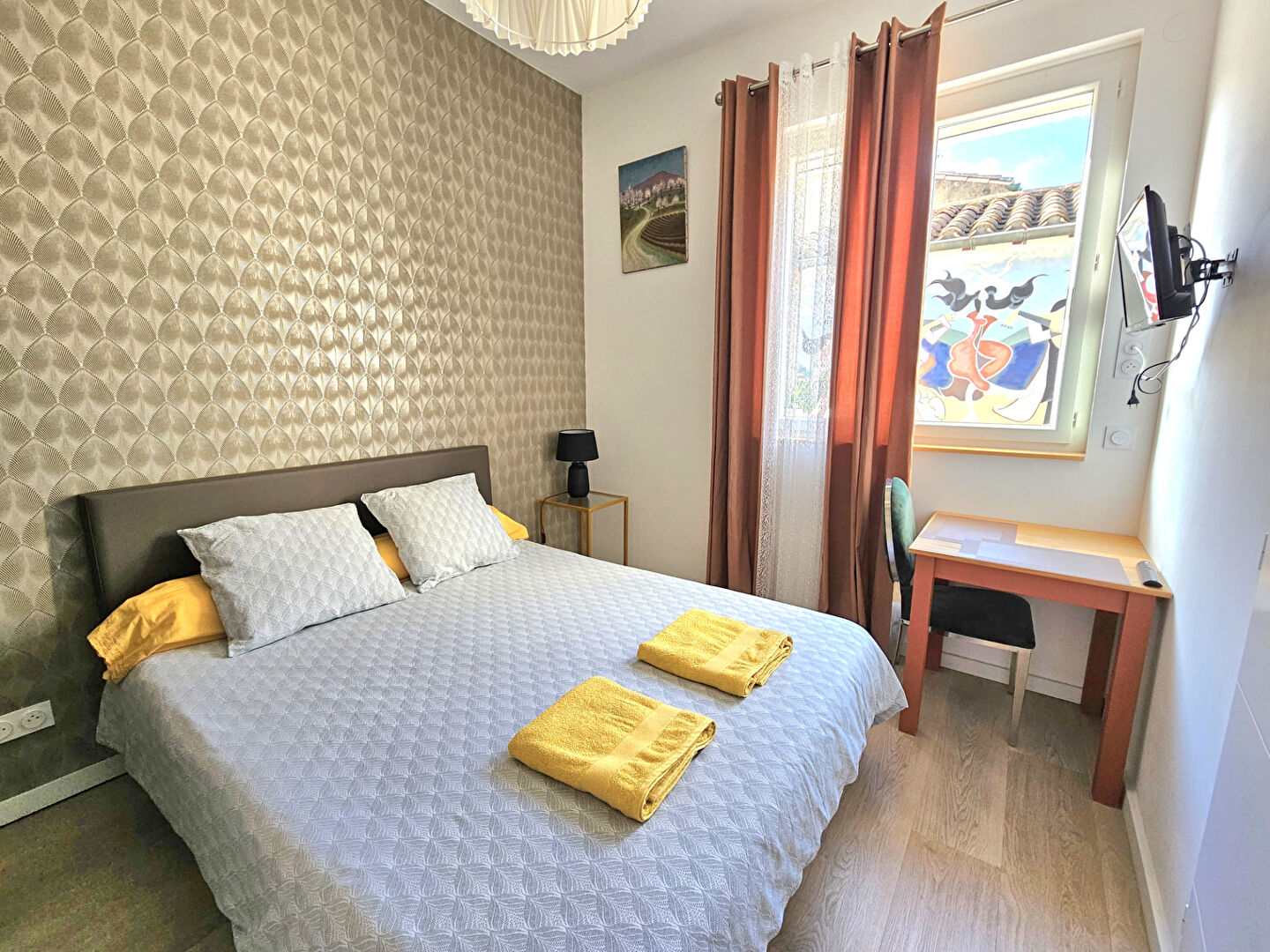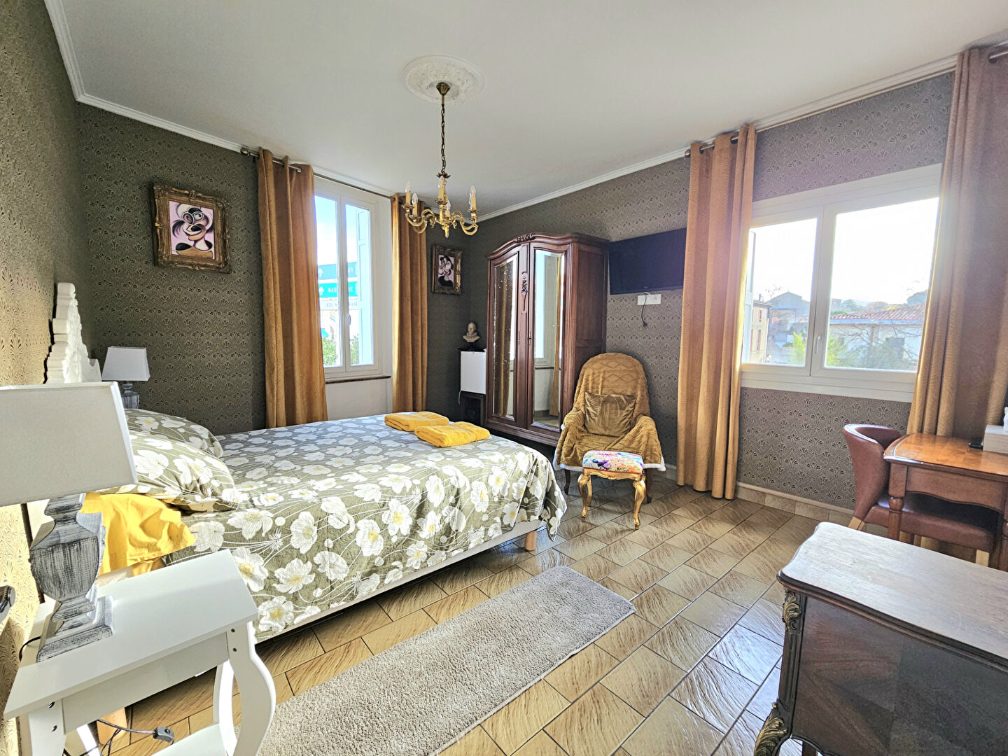 A l'étage, une chambre simple avec salle d'eau, une chambre double avec salle d'eau, une salle à manger pour le service petit-déjeuner, une cuisine à usage privé et une belle terrasse ensoleillée avec vue sur les remparts ; de l'autre côté de la terrasse, un studio de plus de 30 m² peut aussi accueillir une famille. Au deuxième étage enfin, une grande chambre mansardée avec dressing.