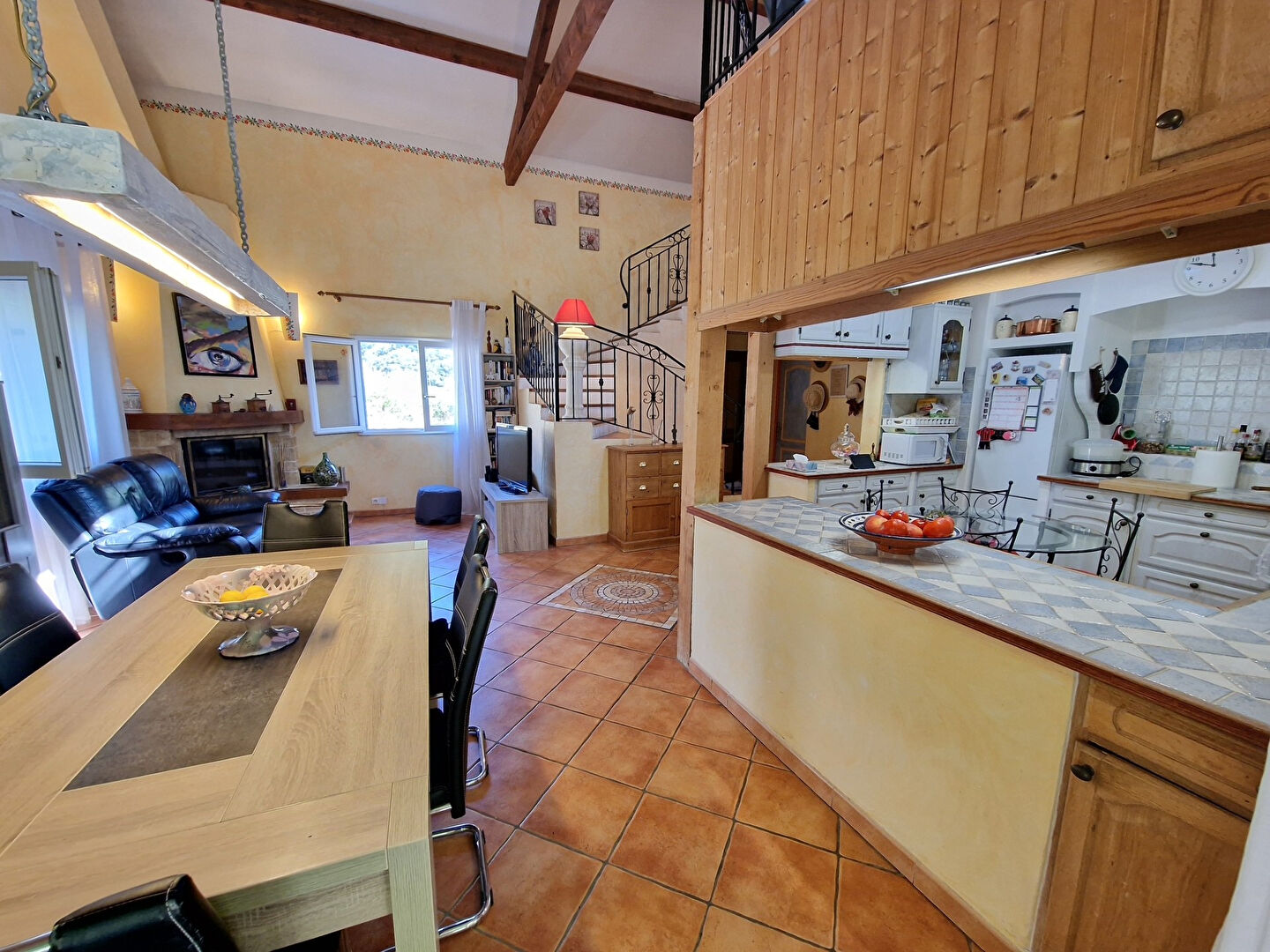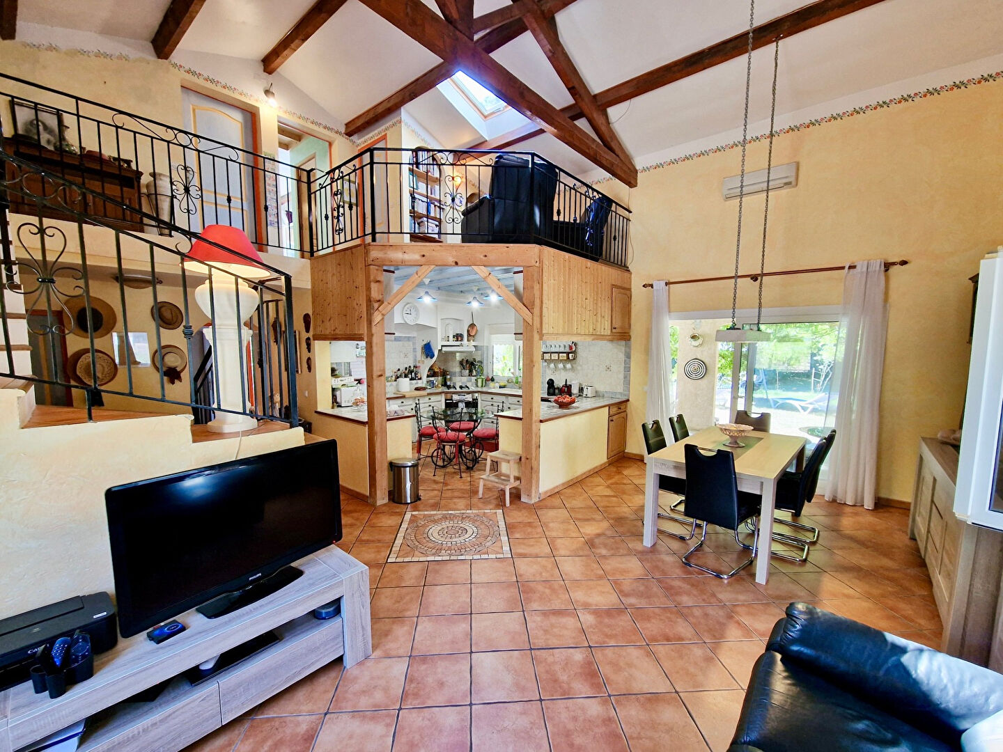 * une vaste pièce de vie dotée d'une belle hauteur sous plafond et ouverte sur la cuisine.