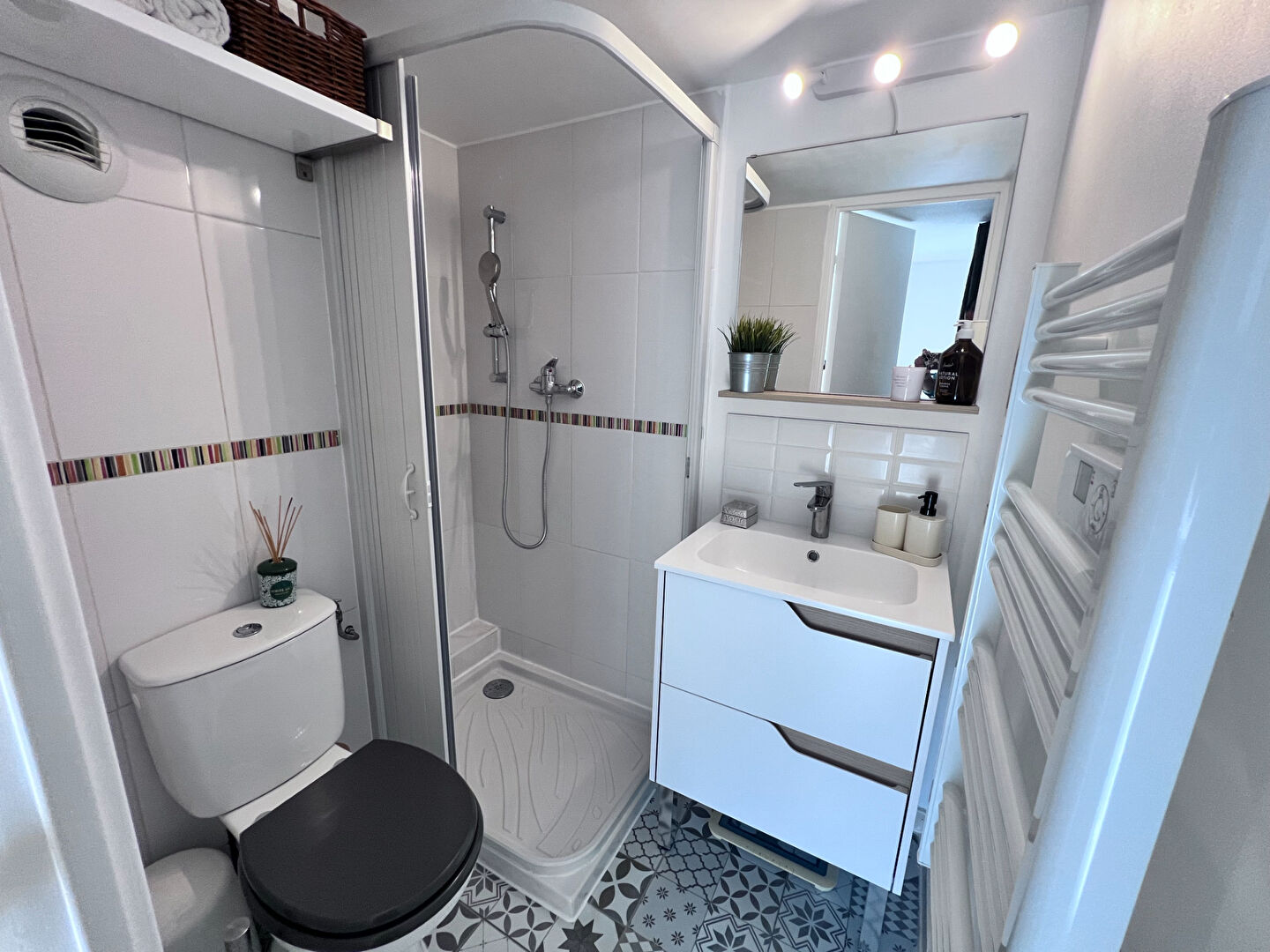 En mezzanine : une chambre cosy accompagnée de sa salle d'eau, formant un espace nuit intime et parfaitement agencé.