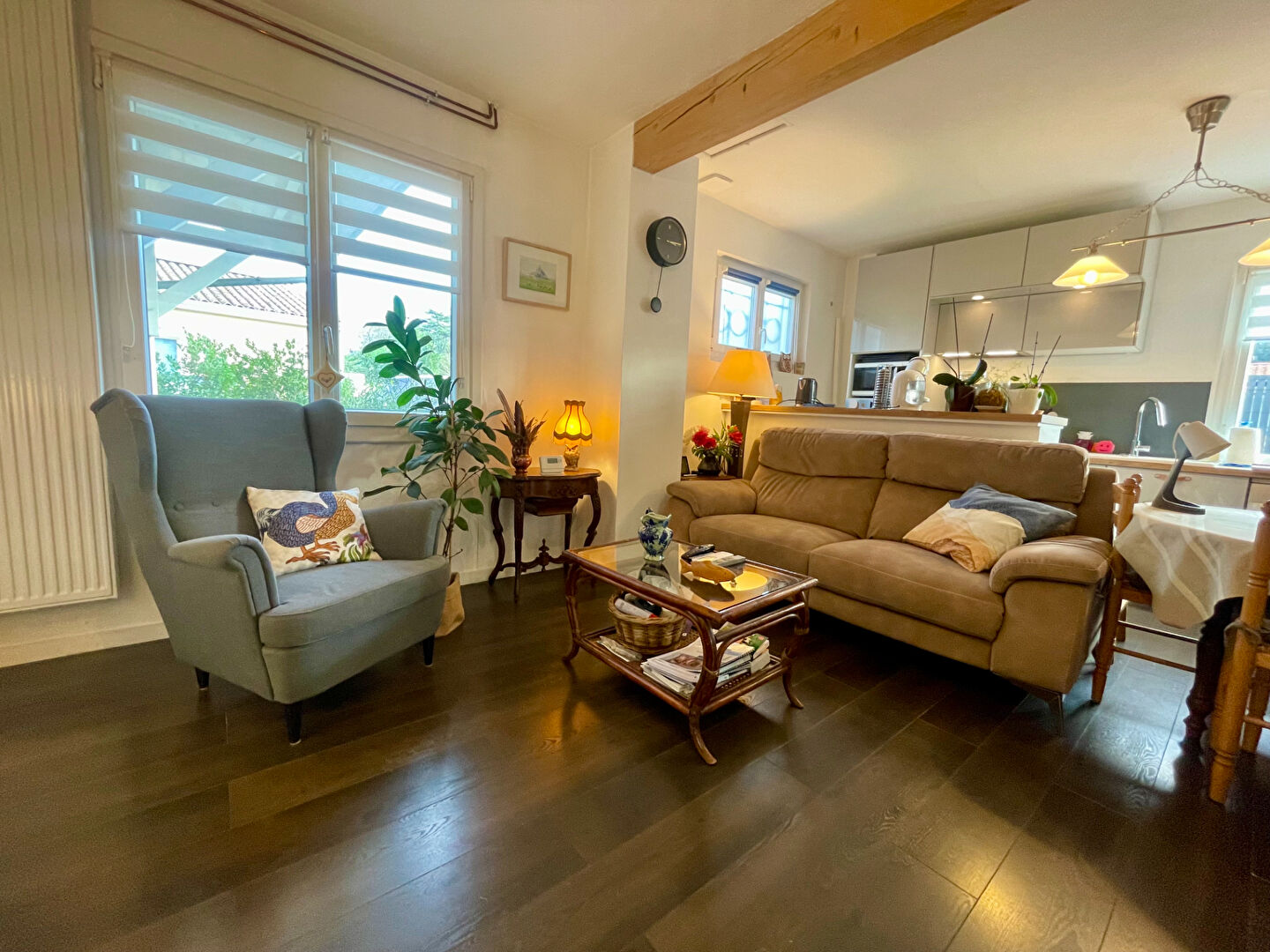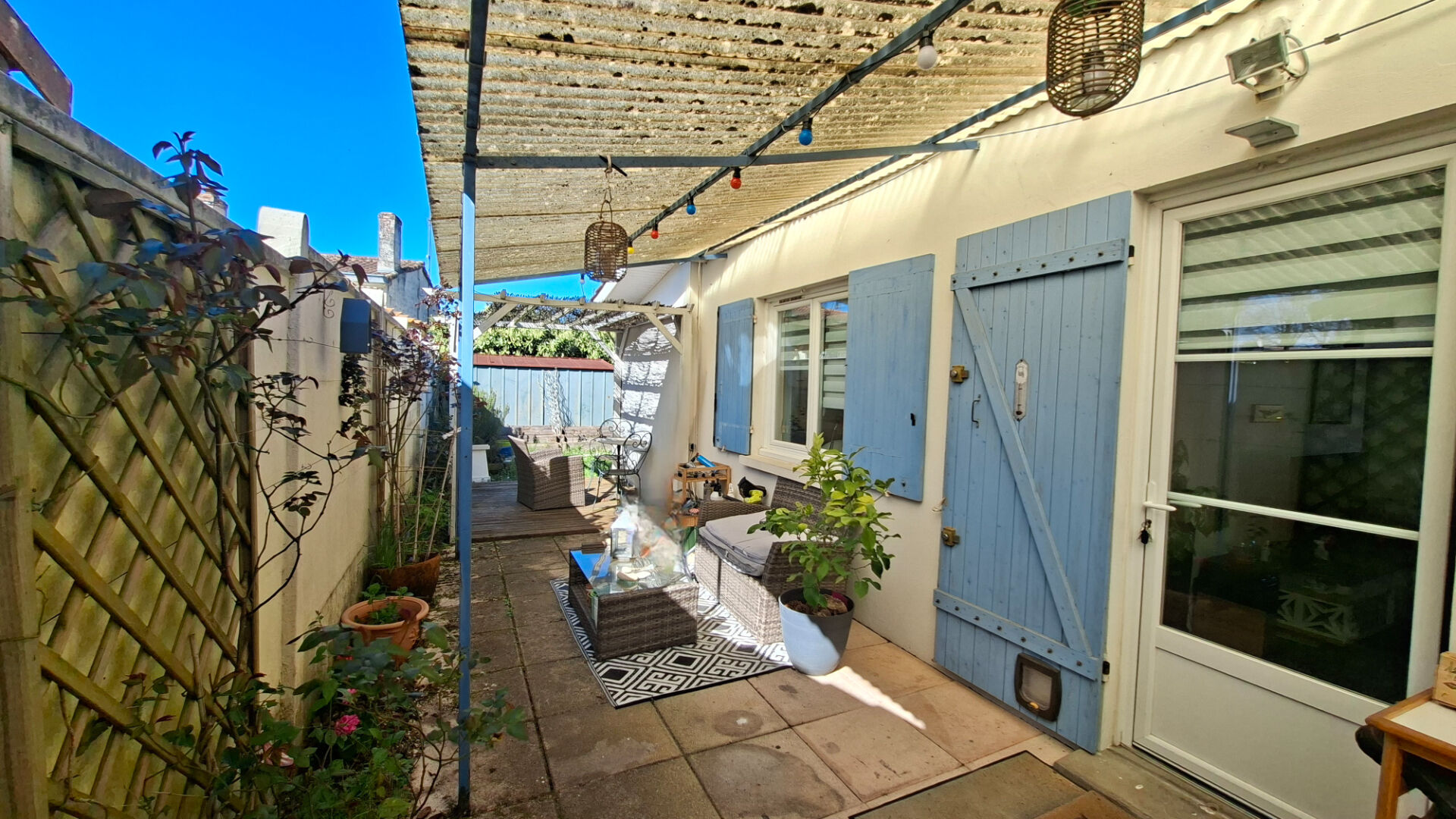 Maison de plain pied comprenant un joli séjour ouvert sur une cuisine aménagée et équipée d'environ 30 m2 , 2 chambres de 12 m2 et de 15 m2, une salle d'eau et un WC séparé .