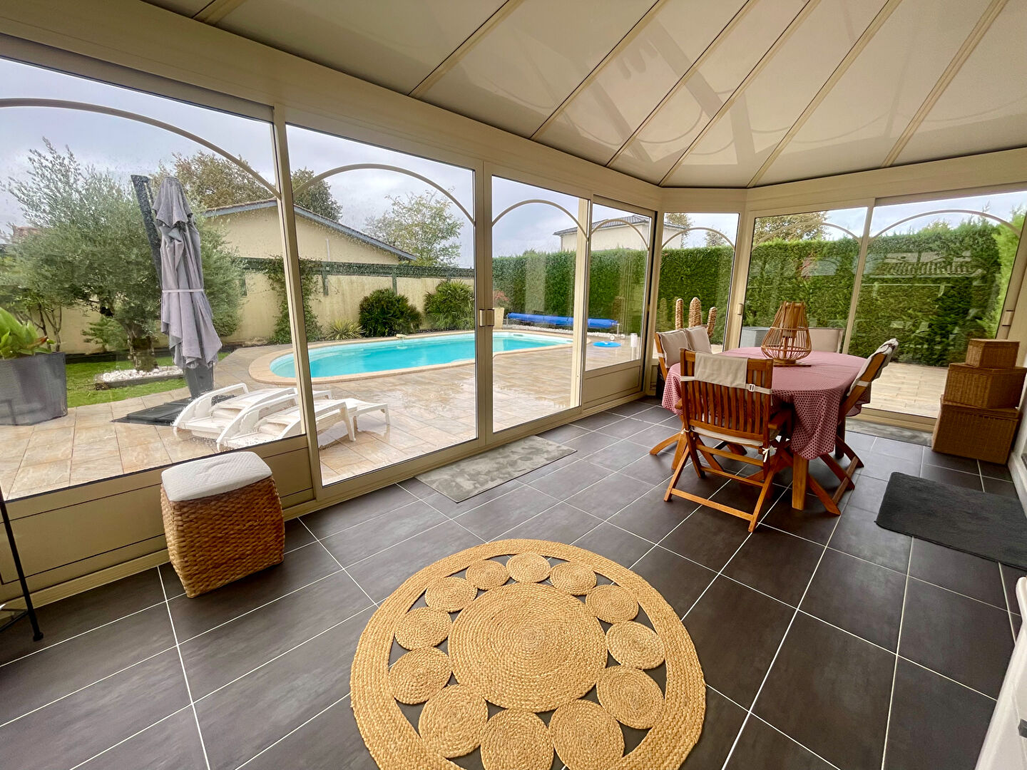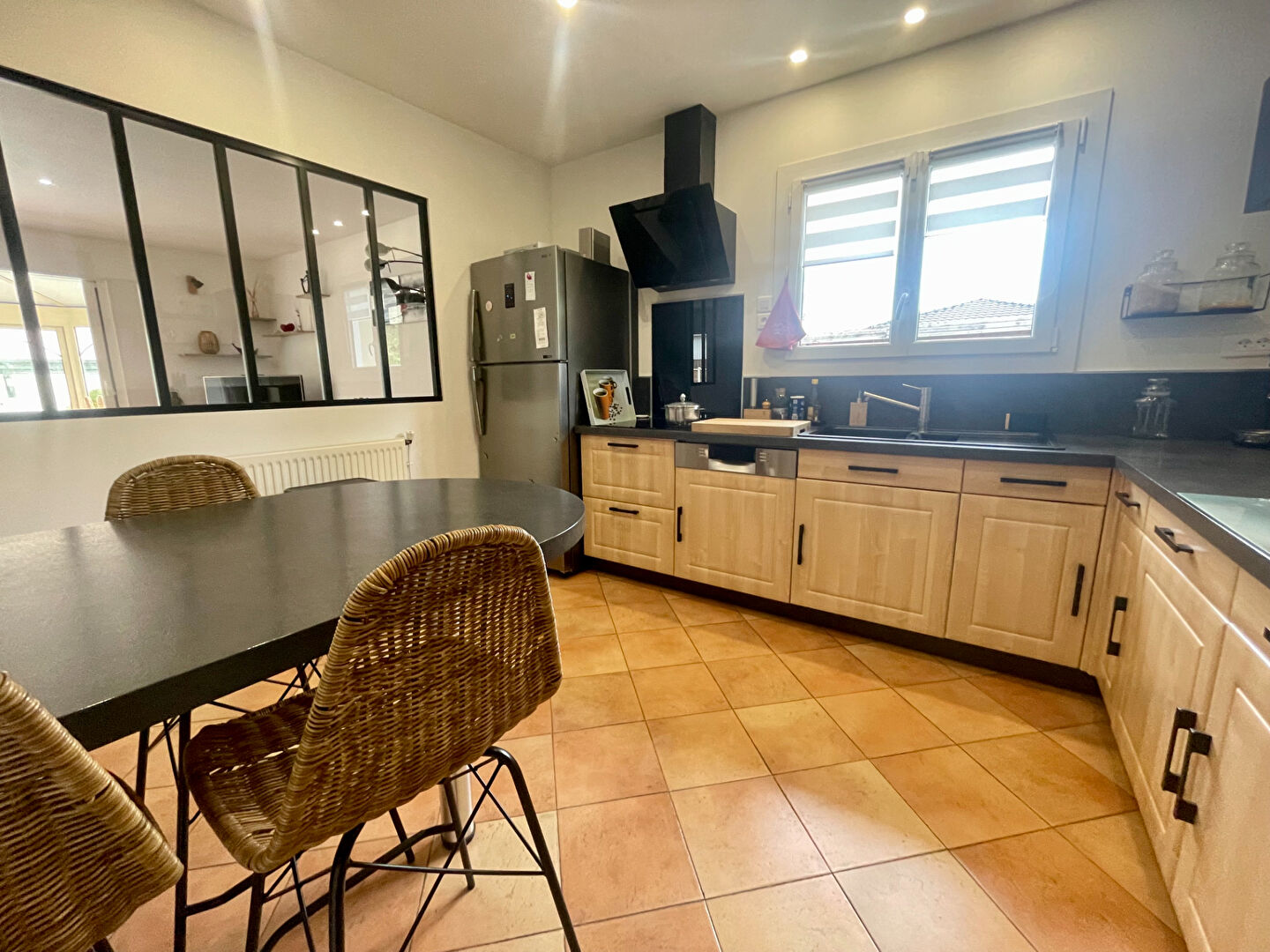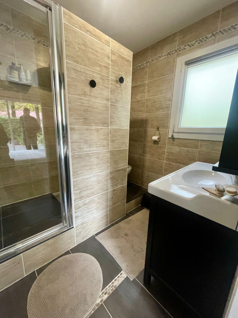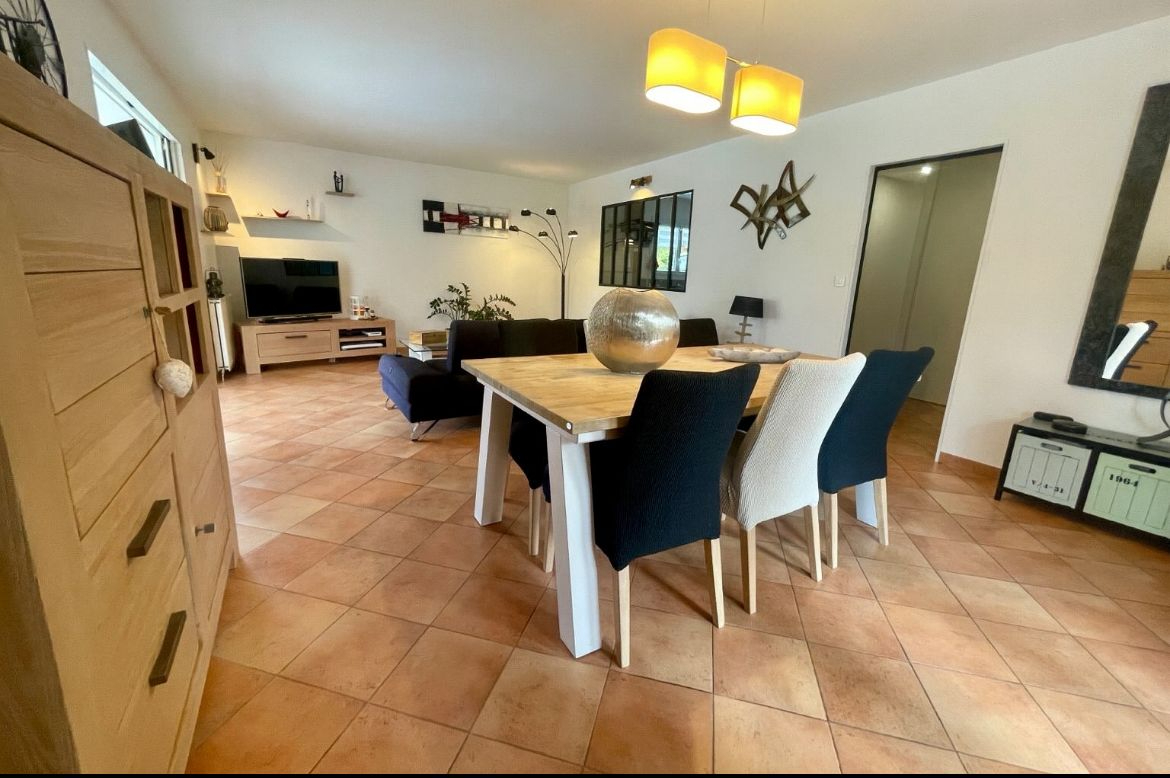 Maison de plain pied comprenant un joli séjour lumineux ainsi qu'une véranda spacieuse et sans vis à vis ,une cuisine aménagée et équipée ,une salle de bains avec douche et baignoire, 4 chambres dont une suite parentale avec salle d'eau et WC attenante ,un WC séparé et une buanderie avec porte de service .