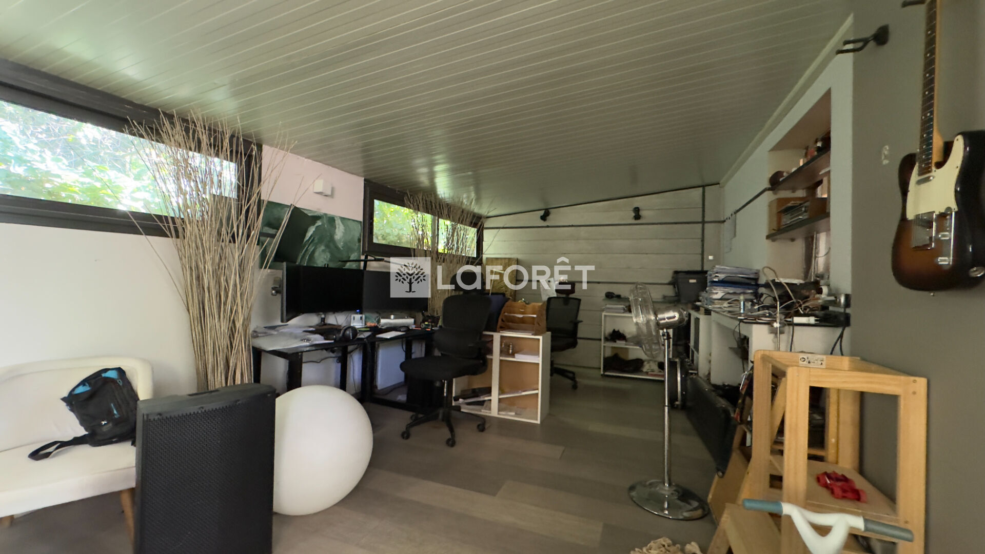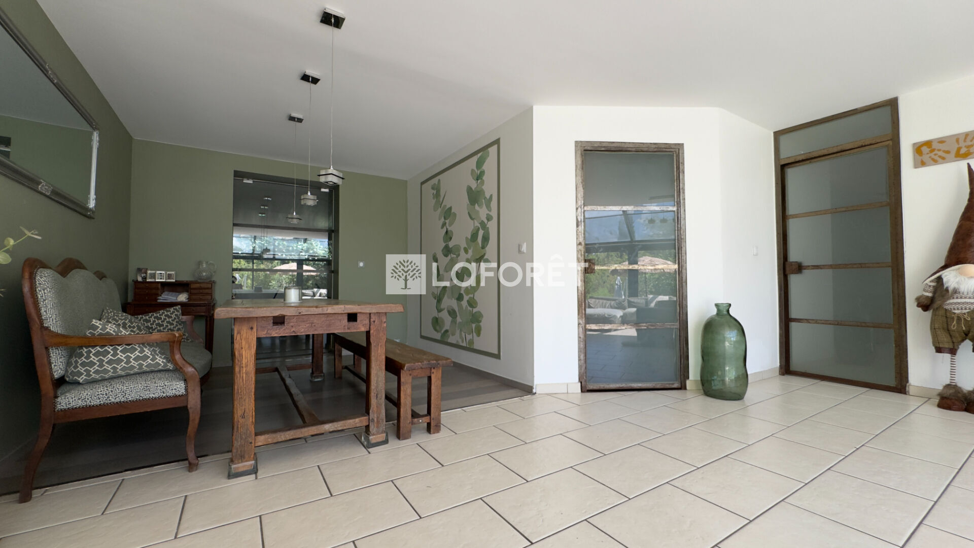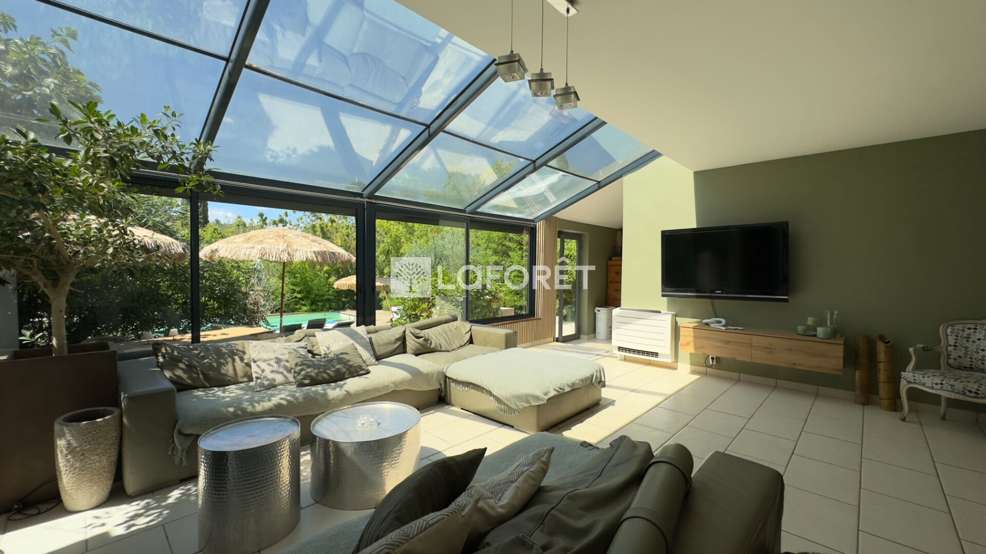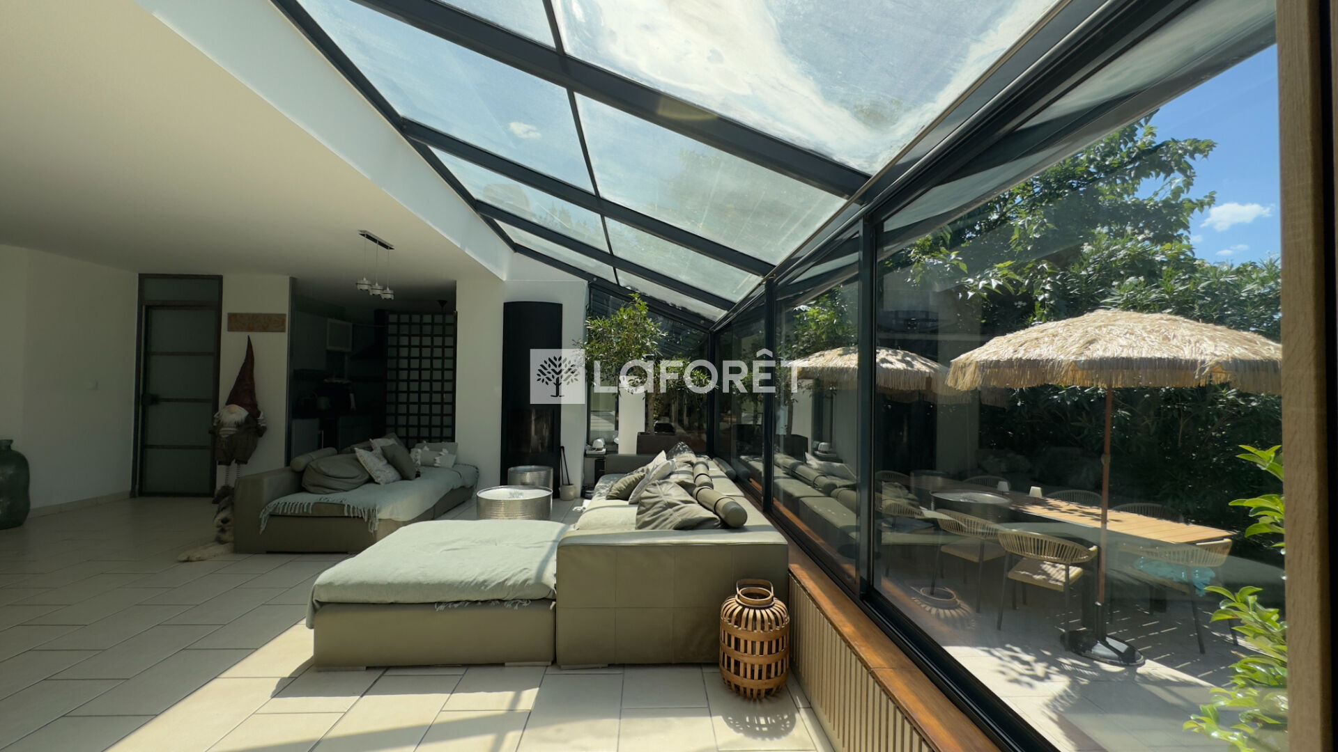Elle se compose d'une spacieuse pièce de vie lumineuse, sublimée par une grande verrière, avec un accès direct à la terrasse et au jardin.