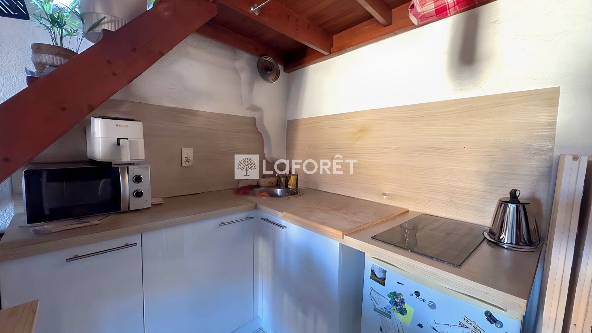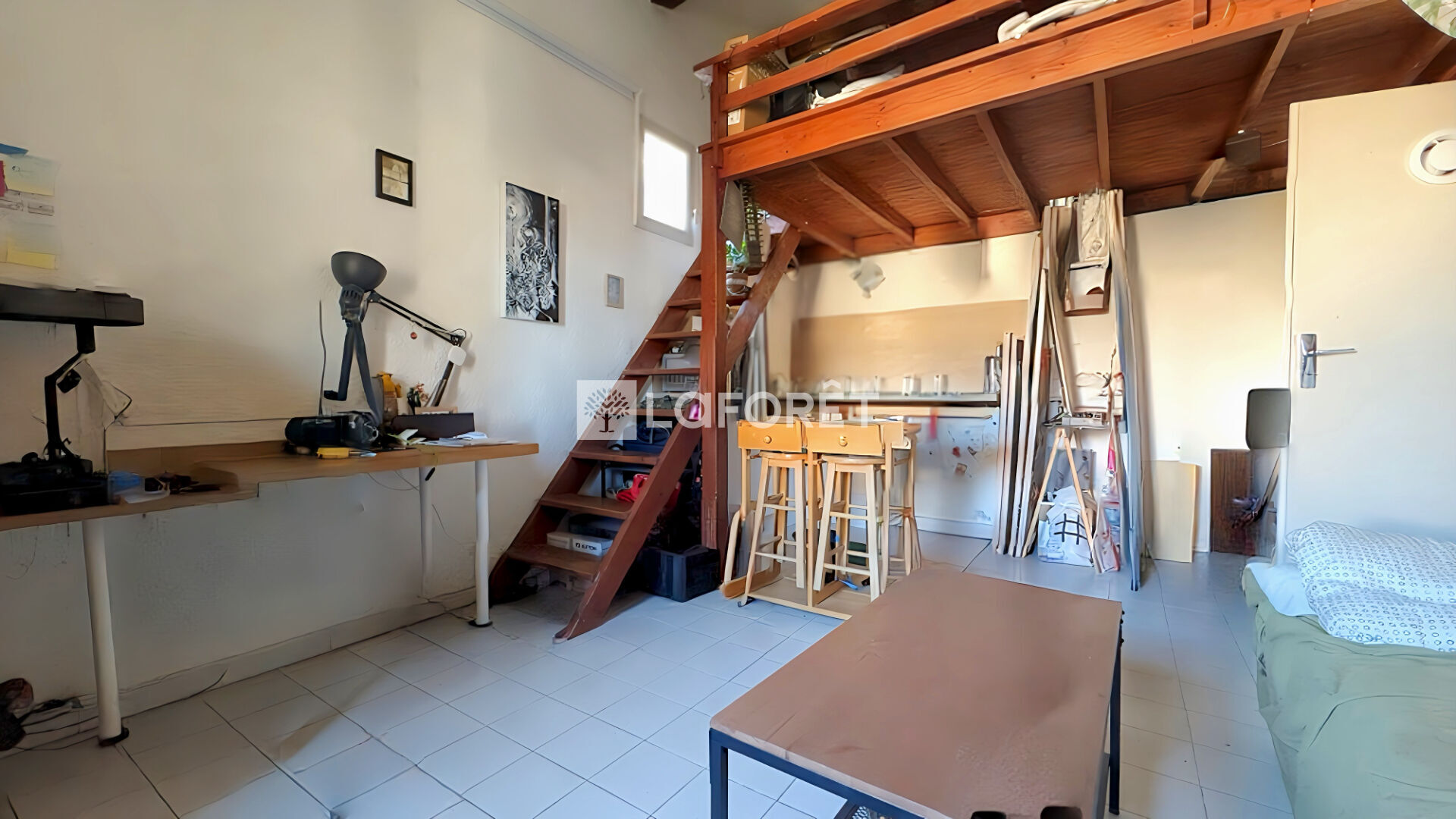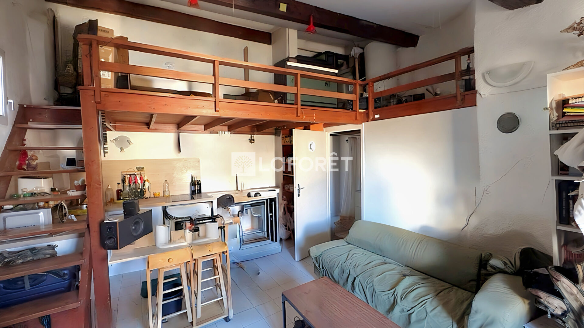Il se compose d'une pièce de vie avec cuisine aménagée et équipée, d'une mezzanine de 9 m² (hors Carrez) offrant un coin nuit + rangement, et d'une salle d'eau avec WC.